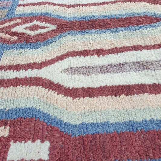 Bebana - Authentic Moroccan Boujad Rug 5x8 ft – Handwoven Cream Base Rug with Tribal Burgundy and Blue Geometric Patterns | 5'08x8'33 Ft | 155x254 cm