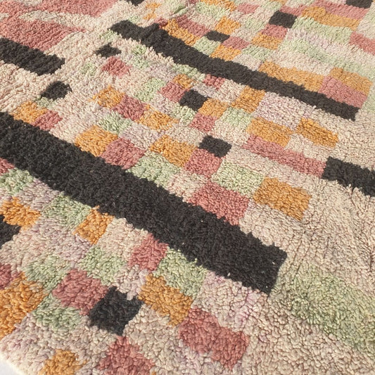 Hmana - Handmade Boujad Rug 9x13 ft – Pastel Pink Beige Black Abstract Geometric Moroccan Wool Carpet | 9'6"x13'9" Ft | 290x421 cm
