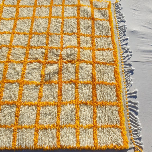 Sfani - Moroccan Rug White Azilal Yellow checkered | Authentic Berber Area Rug | 8'6x4'8 ft