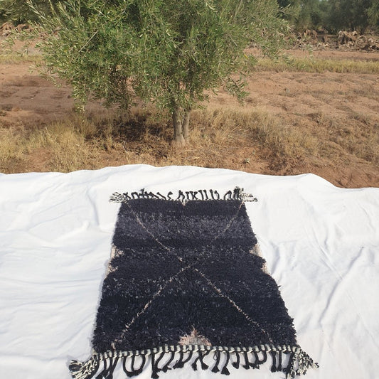 BENI OUARAIN RUG Black Bedroom Carpet | Moroccan High Pile Area Rug Berber Authentic Wool | 4'9x3'3 Ft | 150x100 cm