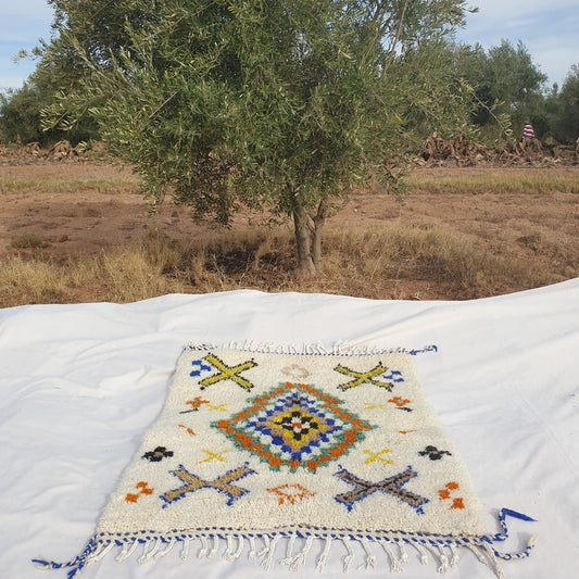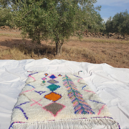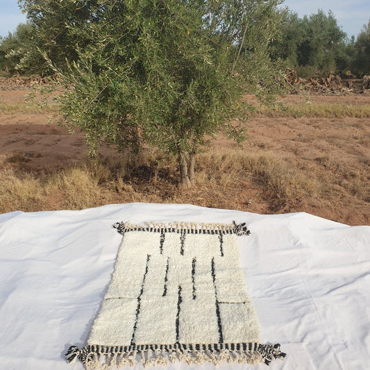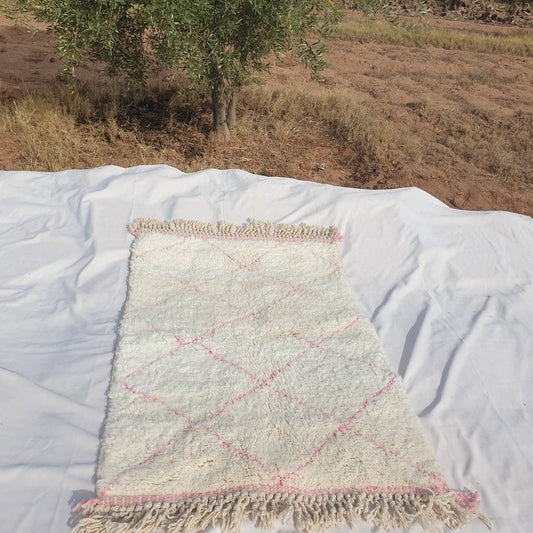 BENI OUARAIN RUG White Bedroom Carpet | Moroccan High Pile Area Rug Berber Authentic Wool | 4'6x3'6 Ft | 140x109 cm