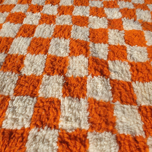 Damia | Orange & White Checkered Beni Ourain 5x8 Authentic Soft Moroccan Rug | 4'96x8'10 Ft | 151x247 cm