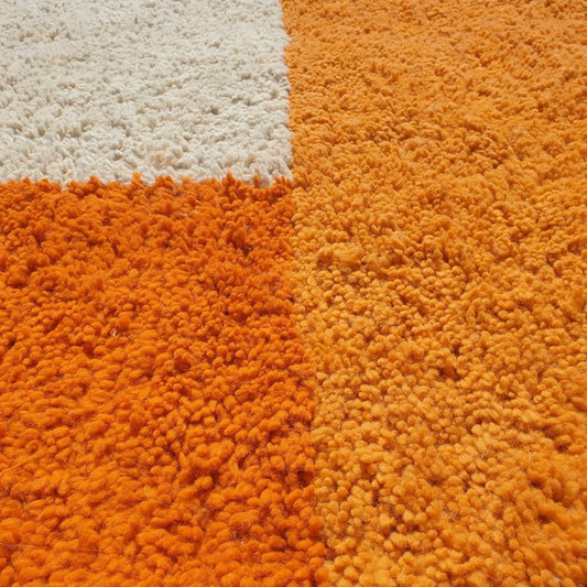 Our orange Moroccan rugs are crafted with premium wool, featuring shades like burnt orange, light orange, and bright orange that evoke Morocco’s vibrant energy. Handwoven by Berber women, these orange Berber rugs showcase geometric and abstract patterns, reflecting tribal heritage. Ideal as orange living room rugs or orange bedroom rugs, they add warmth and sophistication. OunizZ partners directly with weavers for fair wages, ensuring each orange area rug is an authentic masterpiece. Try our Berkana Orange Beni Ourain Moroccan Rug 7x10 for a stunning orange and white checkered rug.