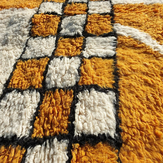 Our yellow Moroccan rugs are crafted with premium wool, featuring shades like mustard yellow, light yellow, and yellow gold that evoke the warmth of Morocco’s sun. Handwoven by Berber women, these yellow Berber rugs showcase geometric and abstract patterns, reflecting tribal heritage. Ideal as yellow living room rugs or yellow bedroom rugs, they add vibrancy and sophistication. OunizZ partners directly with weavers for fair wages, ensuring each yellow area rug is an authentic masterpiece. Try our Mitracia Yellow Moroccan Rug 5x8 for a stunning yellow and white checkered rug.