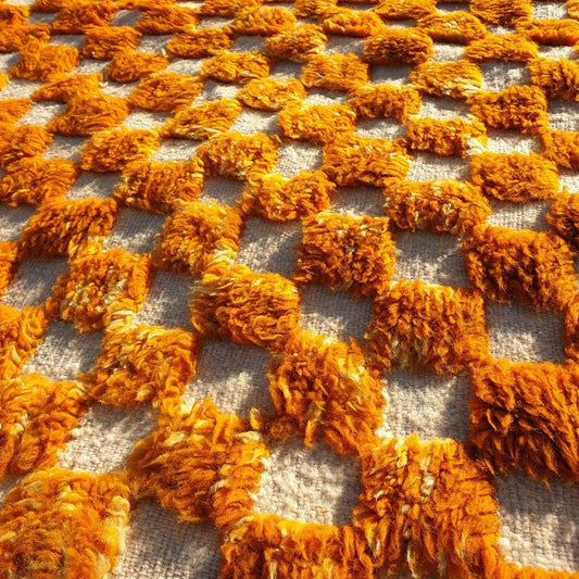 Our yellow Moroccan rugs are crafted with premium wool, featuring shades like mustard yellow, light yellow, and yellow gold that evoke the warmth of Morocco’s sun. Handwoven by Berber women, these yellow Berber rugs showcase geometric and abstract patterns, reflecting tribal heritage. Ideal as yellow living room rugs or yellow bedroom rugs, they add vibrancy and sophistication. OunizZ partners directly with weavers for fair wages, ensuring each yellow area rug is an authentic masterpiece. Try our Mitracia Yellow Moroccan Rug 5x8 for a stunning yellow and white checkered rug.