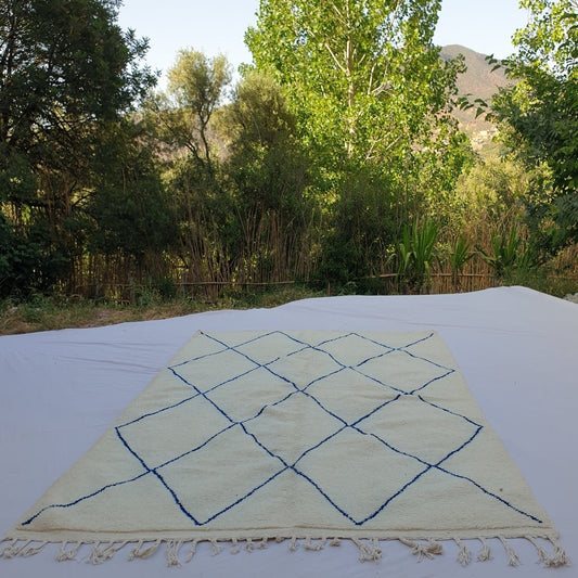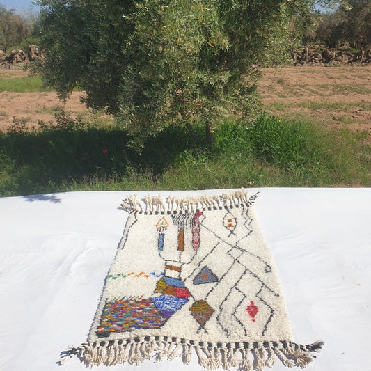 Tagany - BENI OUARAIN Marokkansk hvidt tæppe til soveværelse | Marokkansk højluvet tæppe berber autentisk uld | 5x3'5 Ft | 153x107 cm
