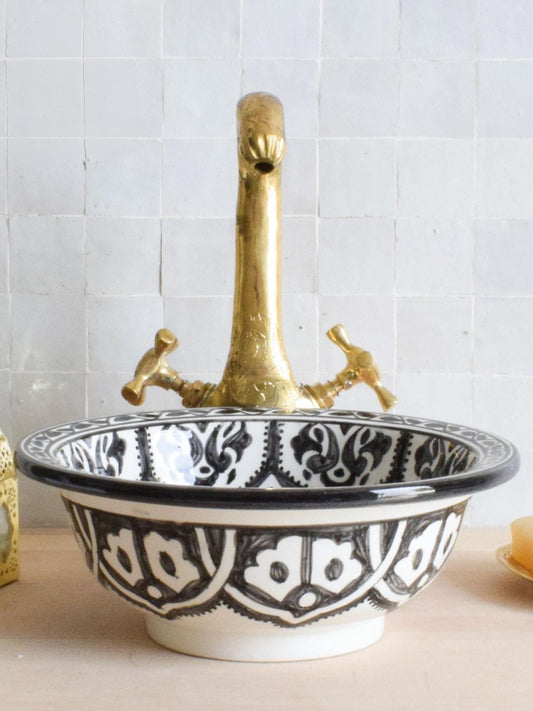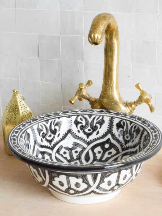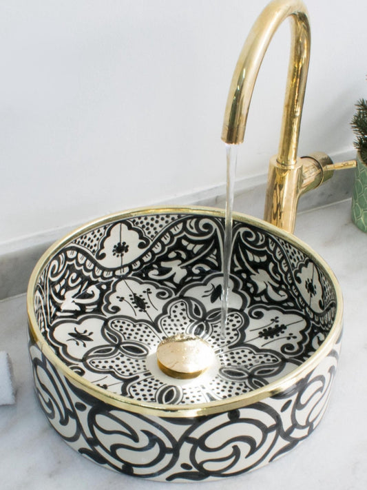 Charleston - Schwarz -Weiß -Runde Waschtisch mit Messingrand - handgefertigtes Keramik -Badezimmerbecken - (ETAT)