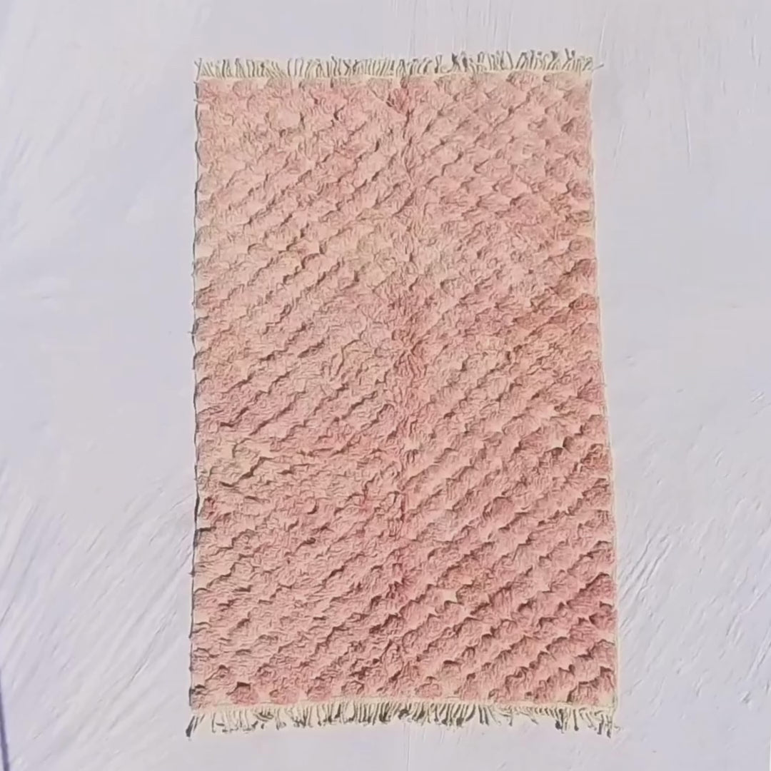 Step into luxury with the 5x8 Pink Moroccan Shag Rug, a stunning Beni Mrirt wool rug handwoven in the Middle Atlas Mountains of Morocco. This pink rug for bedroom boasts a plush high pile and soft texture, making it an exquisite bedroom rug or carpet for bedroom. Featuring a vibrant blend of soft pink, warm pink, beige, and soft peach, this colorful Moroccan rug brings bohemian flair to any space. Measuring 5x8 feet (161x253 cm), this handwoven wool rug is perfect for rugs for queen size beds or as a large bedroom rug to enhance your master bedroom.