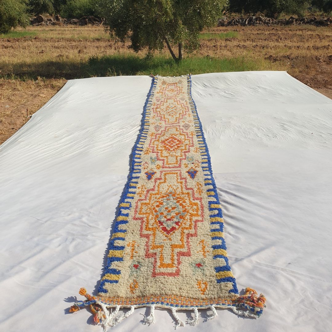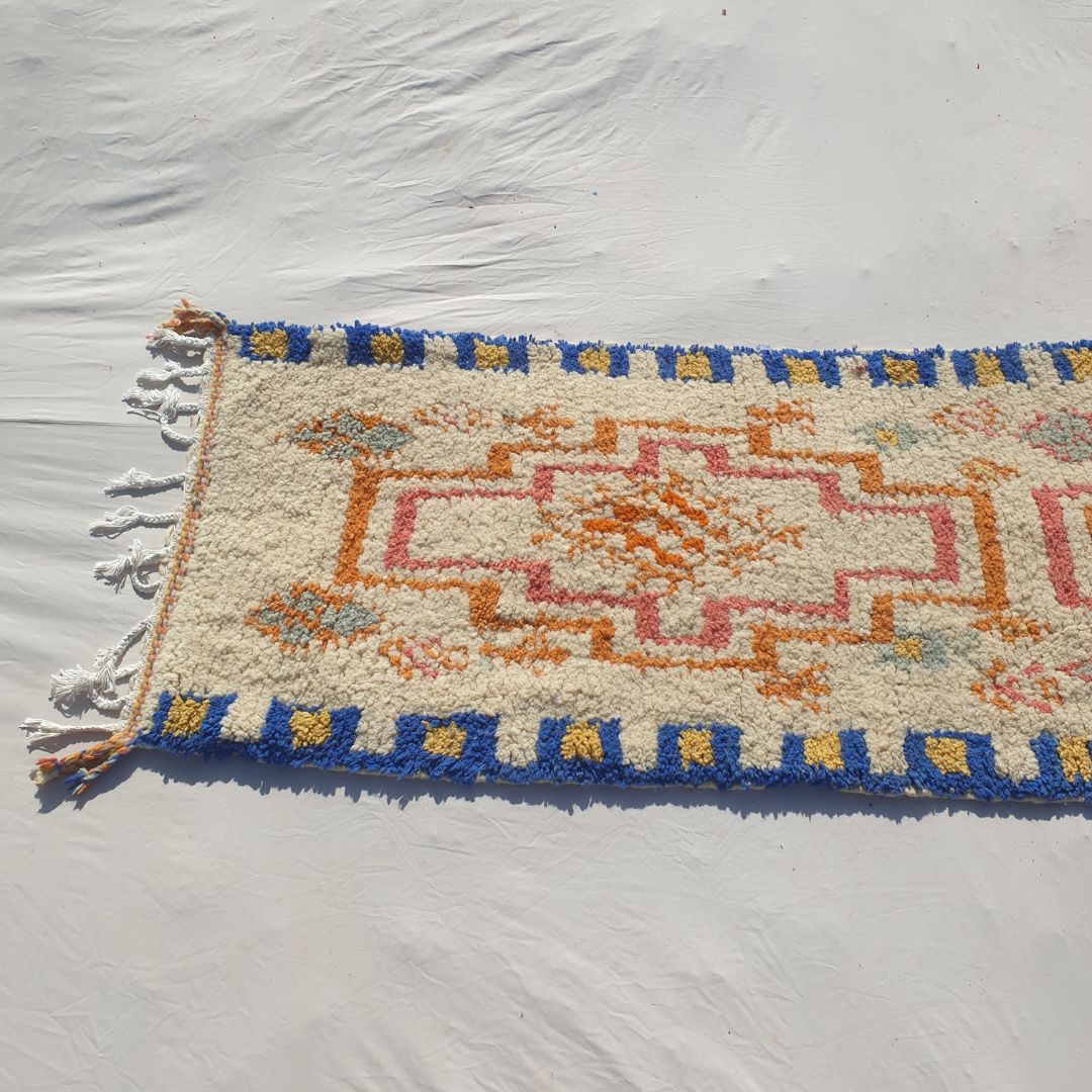 Add a vibrant touch to your hallway with this 2'66x19'39 Peach Moroccan Runner Rug, handwoven by skilled artisans in Morocco. Featuring a cream base with intricate geometric and abstract patterns in peach, pink, blue, and yellow, this boho runner rug brings warmth and charm to narrow spaces. Crafted from premium wool, its soft, plush texture offers cozy comfort, making it perfect for hallways, entryways, or bedside areas. Measuring 2'66x19'39 Ft | 81x591 cm, this newly made Boujaad rug blends traditional craftsmanship with modern boho style, creating a stunning statement piece for your home.
