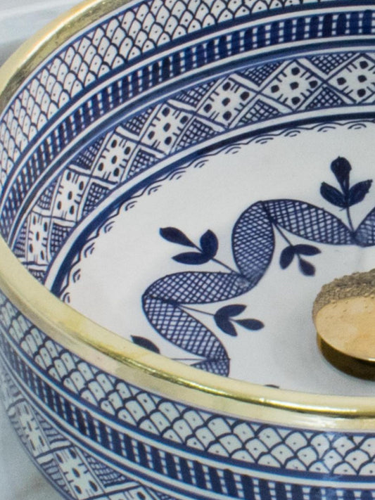 Tetouan - Moroccan Round Vanity Sink with Brass Rim – Handmade Ceramic Bathroom Basin in Blue- (ETAT)