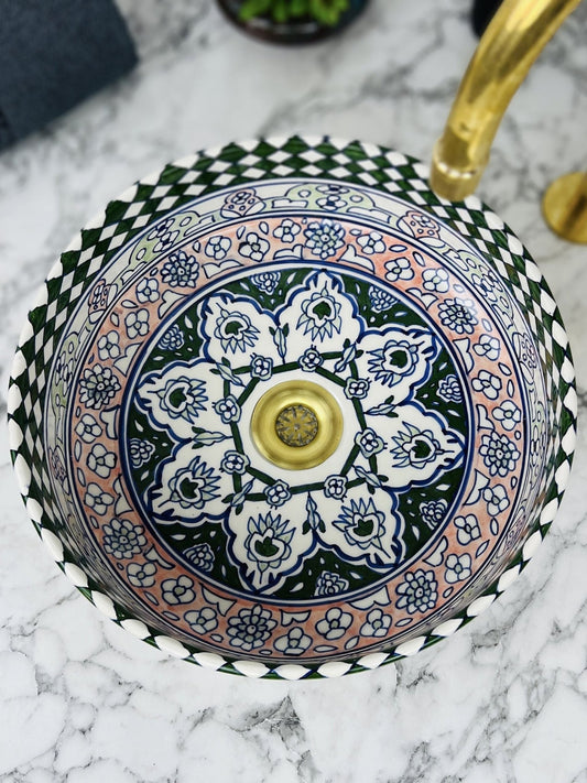 Valencia - Handmade Moroccan Ceramic Sink – Green and Peach Patterned Bathroom Vessel Sink - (ETMMT)