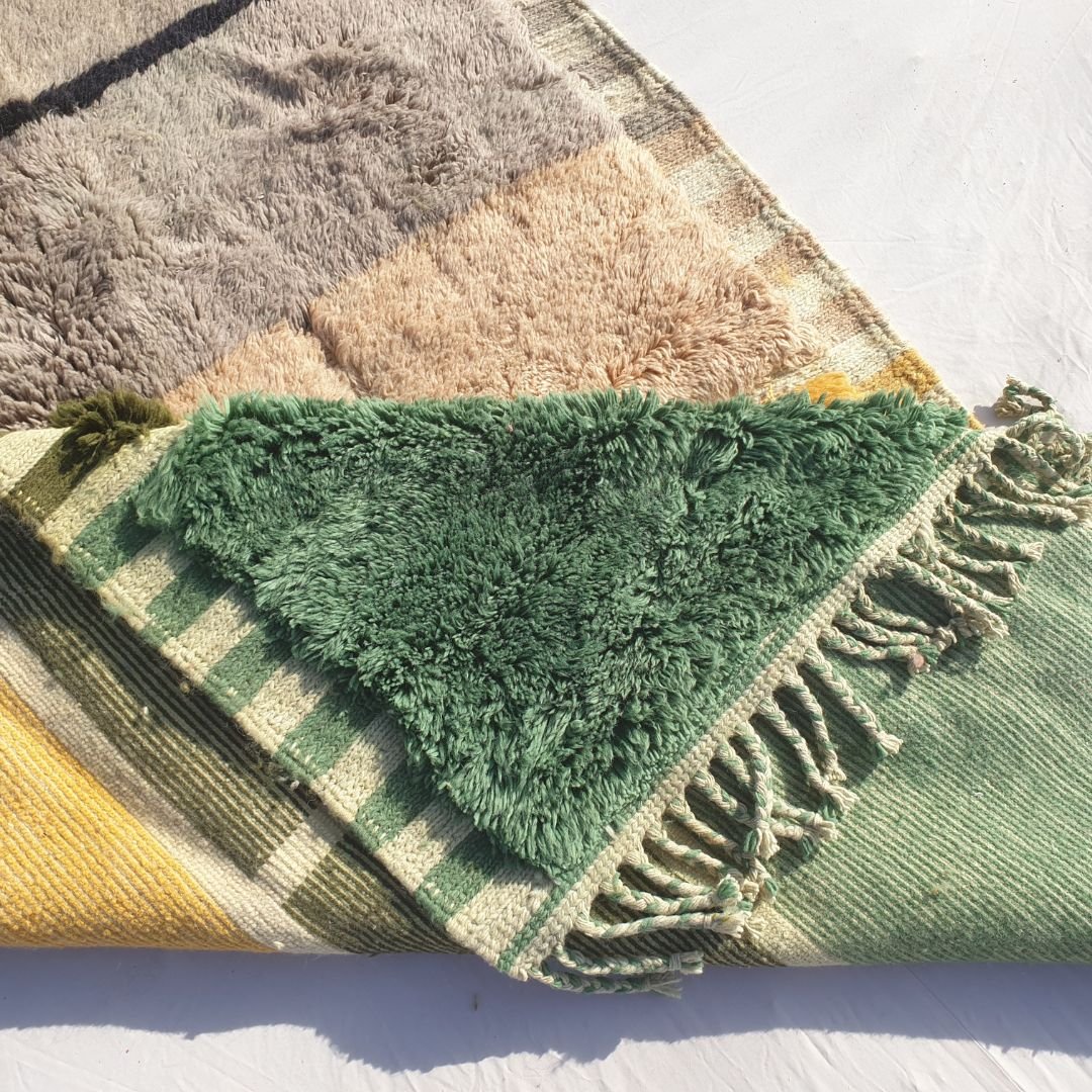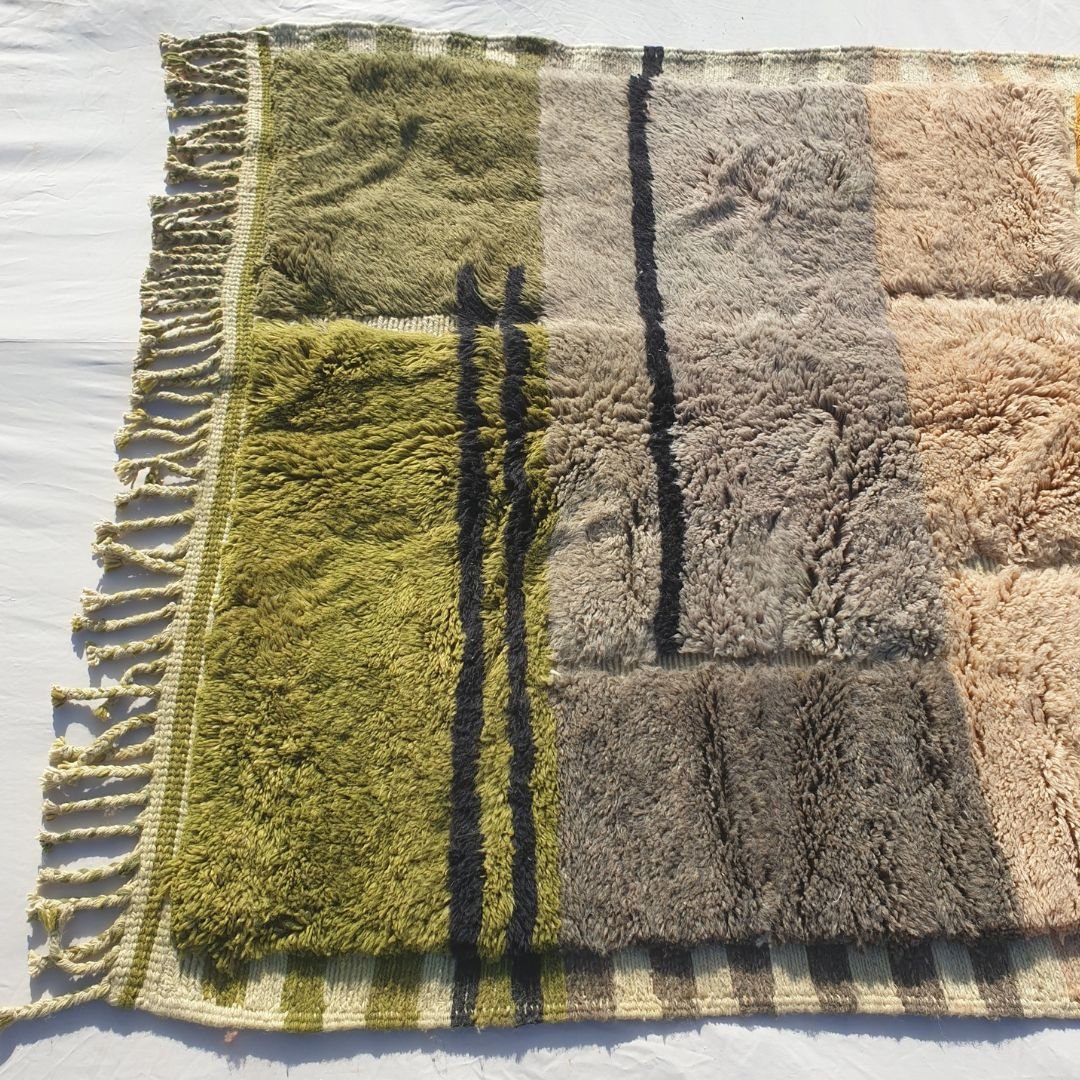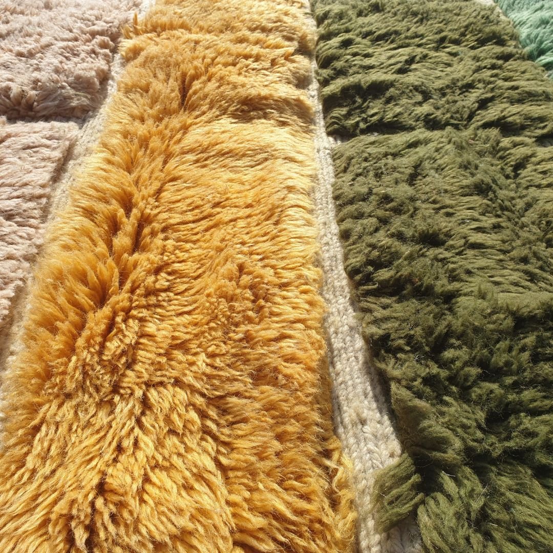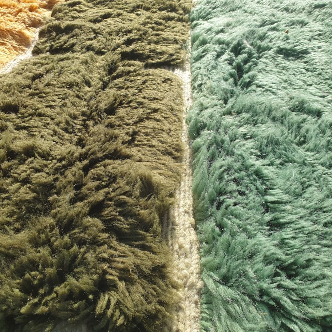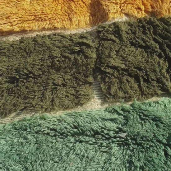 Both Beni Ourain and Beni Mrirt are iconic Moroccan rugs, but they differ in style and construction. Beni Ourain rugs are known for their minimalist geometric patterns and neutral tones, offering a lighter, less dense feel. Conversely, Beni Mrirt rugs feature a thicker, shaggier pile with bold colors like olive green and mustard yellow, showcasing a more luxurious and robust build. The Beni Mrirt’s double-knotted technique and higher wool content make it a luxury shaggy rug, perfect for a fluffy rug for bedroom with added warmth. Discover more at our Beni Ourain Rug and Beni Mrirt Rugs collections.