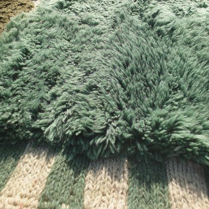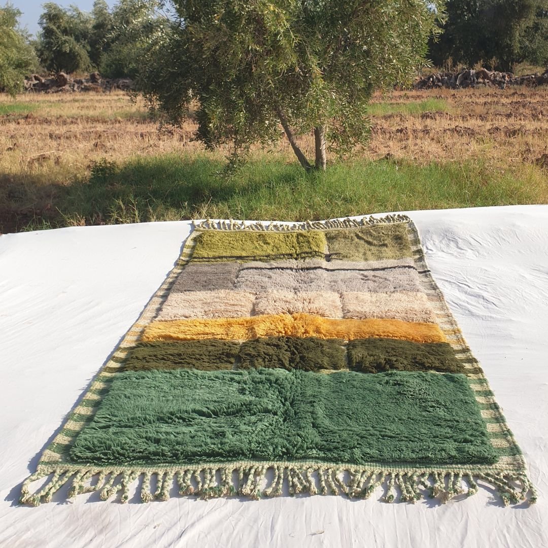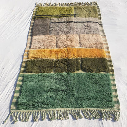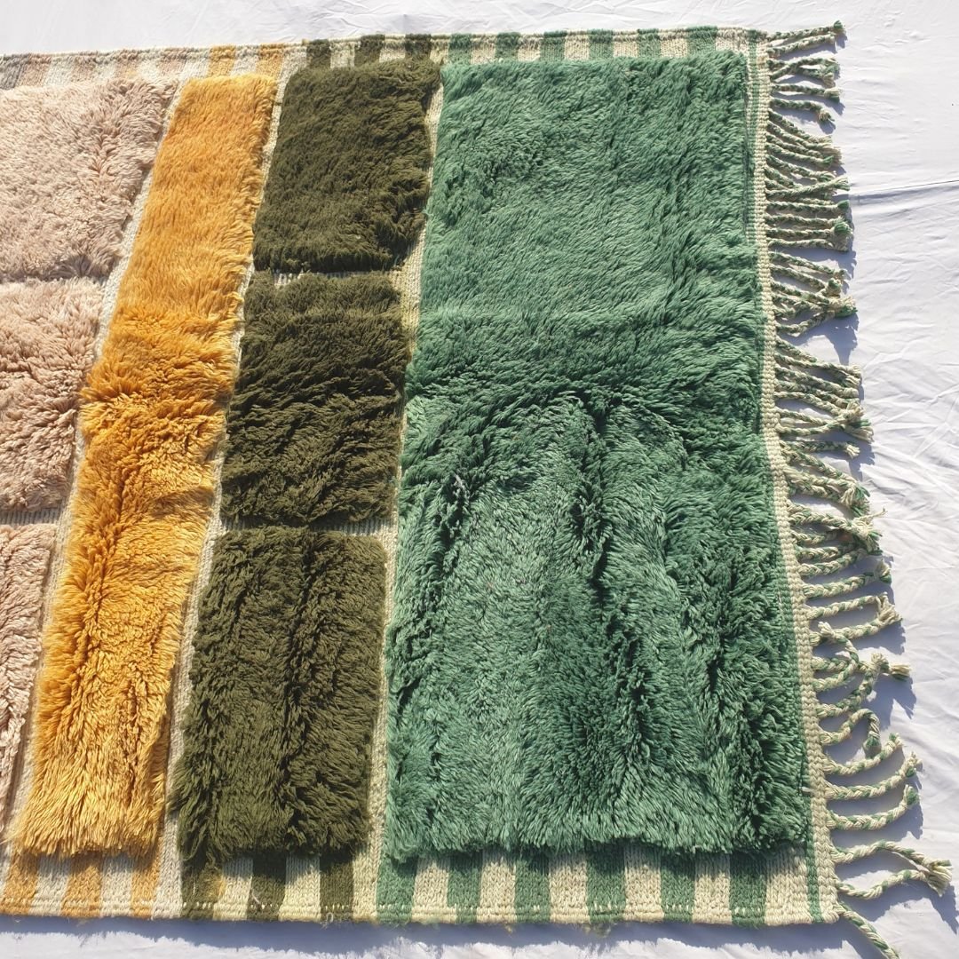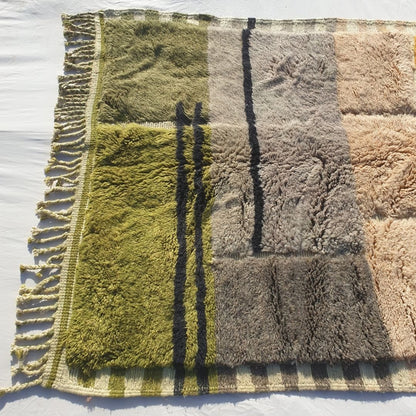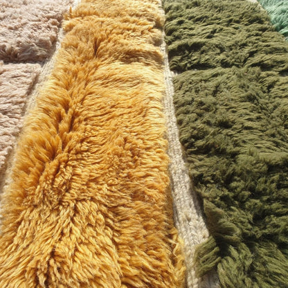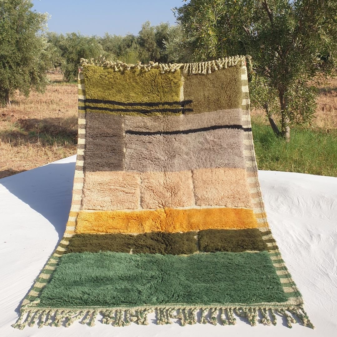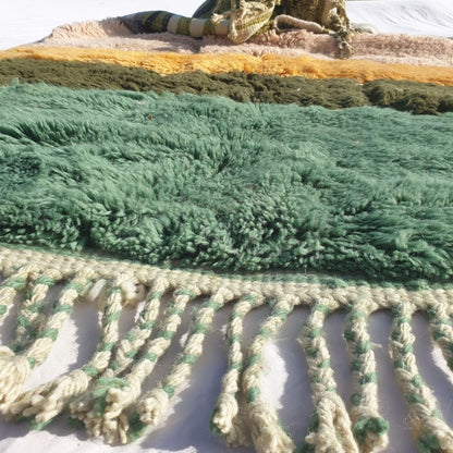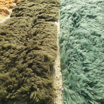 Step into luxury with the 5x8 Olive Green Moroccan Shag Rug, a stunning Beni Mrirt wool rug handwoven in the Middle Atlas Mountains of Morocco. This green rug for bedroom boasts a plush high pile and soft texture, making it an exquisite bedroom rug or carpet for bedroom. Featuring a vibrant blend of olive green, forest green, mustard yellow, beige, and soft peach, this colorful Moroccan rug brings bohemian flair to any space. Measuring 5x8 feet (160x255 cm), this handwoven wool rug is perfect for rugs for queen size beds or as a large bedroom rug to enhance your master bedroom.