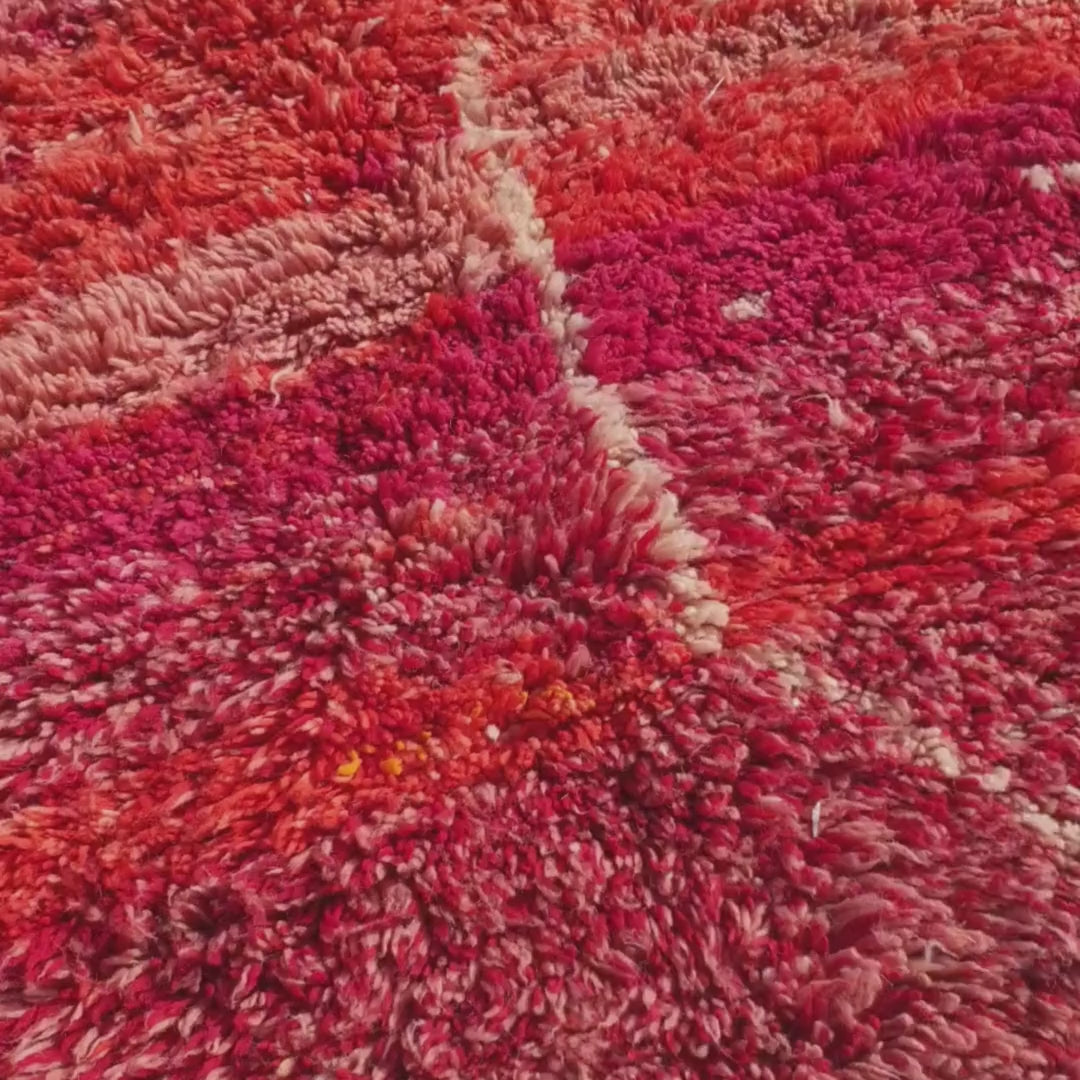 Transform your space with this large Beni Mrirt oversized rug, measuring 10'x13'19 Ft | 306x402 cm. Handwoven with exceptional skill, this ultra-soft, plush, and fluffy rug features a vibrant red base with multicolored abstract patterns in orange, yellow, white, purple, and black, making it a stunning centerpiece for large areas like living rooms or dining rooms. Known for their luxurious softness, Beni Mrirt rugs bring both comfort and artistry to your home. Crafted from 100% natural wool, this oversized Moroccan rug is perfect for bohemian or modern decor.