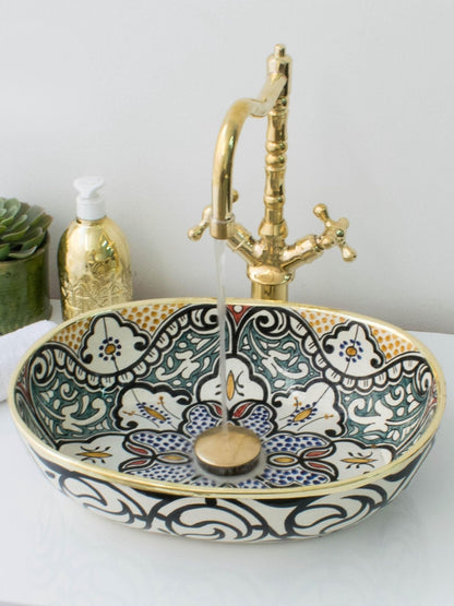 Elevate your bathroom with this stunning oval bathroom sink, a handcrafted ceramic bathroom sink that blends Moroccan artistry with modern elegance. Perfect as an oval vessel sink or drop-in sink, this luxury bathroom sink features hand-painted patterns in vibrant hues, ideal for luxury powder room vanities or en-suites. Lead-free, customizable, and paired with a brass drain for just $9, it’s a standout modern bathroom sink for US and UK homes. Shop now with free fast shipping and add a fancy bathroom sink to your vanity sink space!