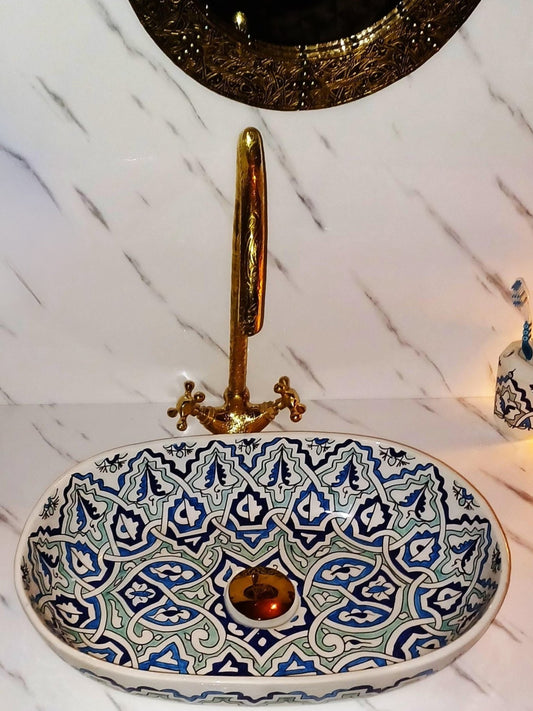 Elevate your bathroom with our handcrafted vanity sinks, featuring Moroccan bathroom sinks made by skilled artisans. These ceramic bathroom sinks combine traditional Moroccan artistry with modern style, ideal for vessel sinks for bathroom, farmhouse bathroom sinks, or luxury bathroom sinks in US homes. Unlike mass-produced porcelain sinks, our Moroccan sinks are lead-free, hand-painted, and customizable, showcasing vibrant patterns in turquoise, terracotta, and cream. Perfect for boho bathroom sinks or minimalist vanities, our bowl sink vanities transform powder rooms and master baths. Shop now for free fast shipping and add a luxury ceramic sink to your US bathroom!