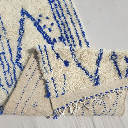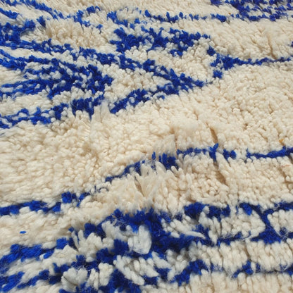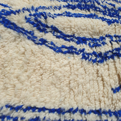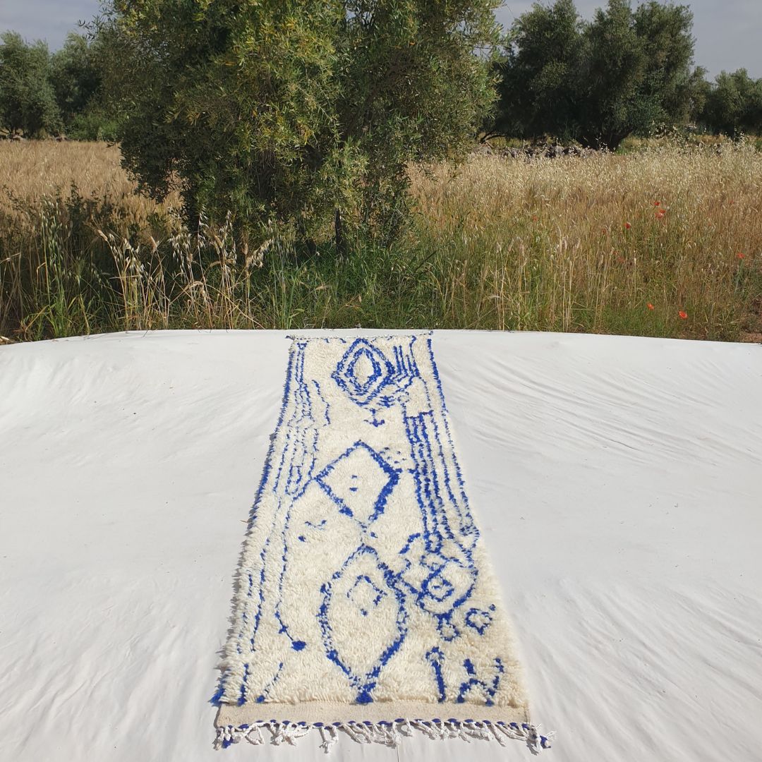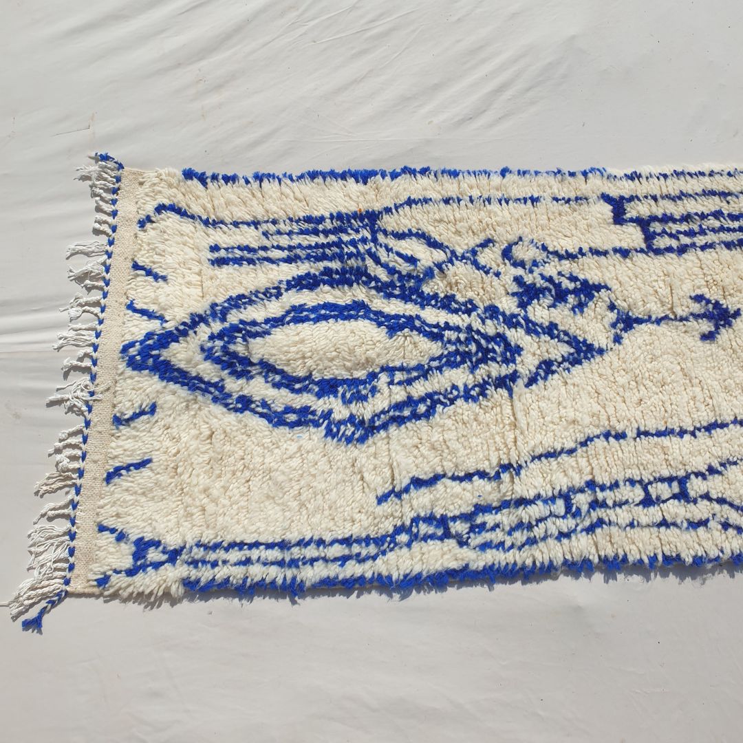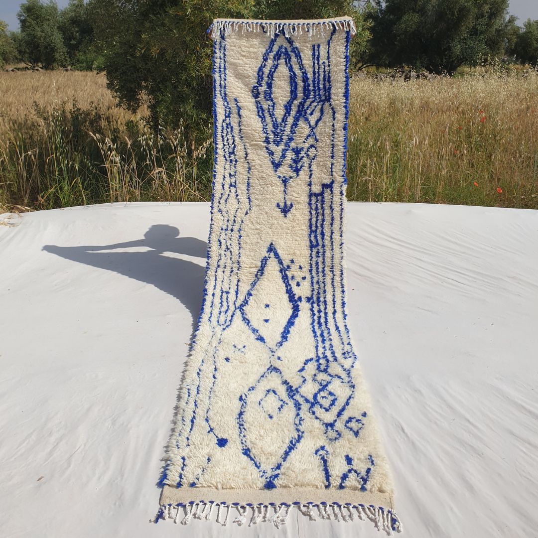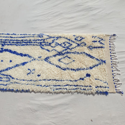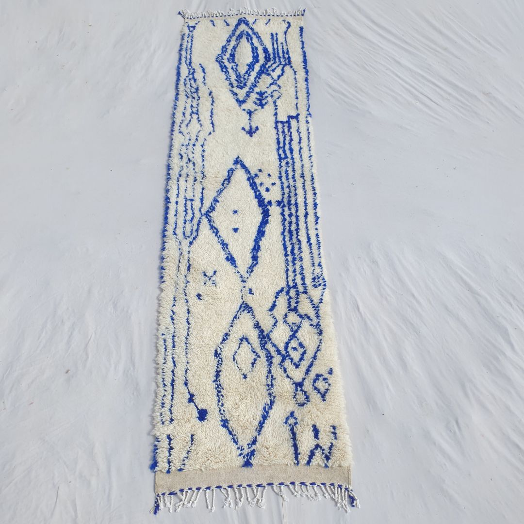 Enhance your narrow spaces with this Blue and White Moroccan Runner Rug, measuring 2'62x10'46 Ft | 80x319 cm. Handwoven by skilled artisans in the Azilal tradition, this rug features a modern abstract design with intricate blue patterns on a soft cream base. Perfect for hallways, entryways, or kitchens, its plush texture and artistic style make it an ideal addition to modern, minimalist, or boho decor. This runner combines the timeless charm of Moroccan craftsmanship with a contemporary flair, creating a striking focal point for your home.