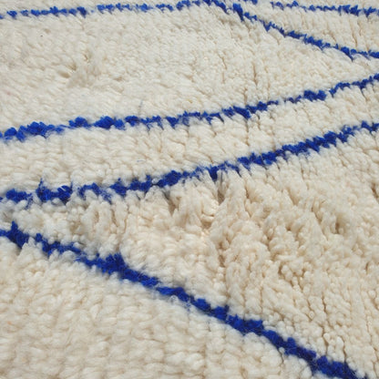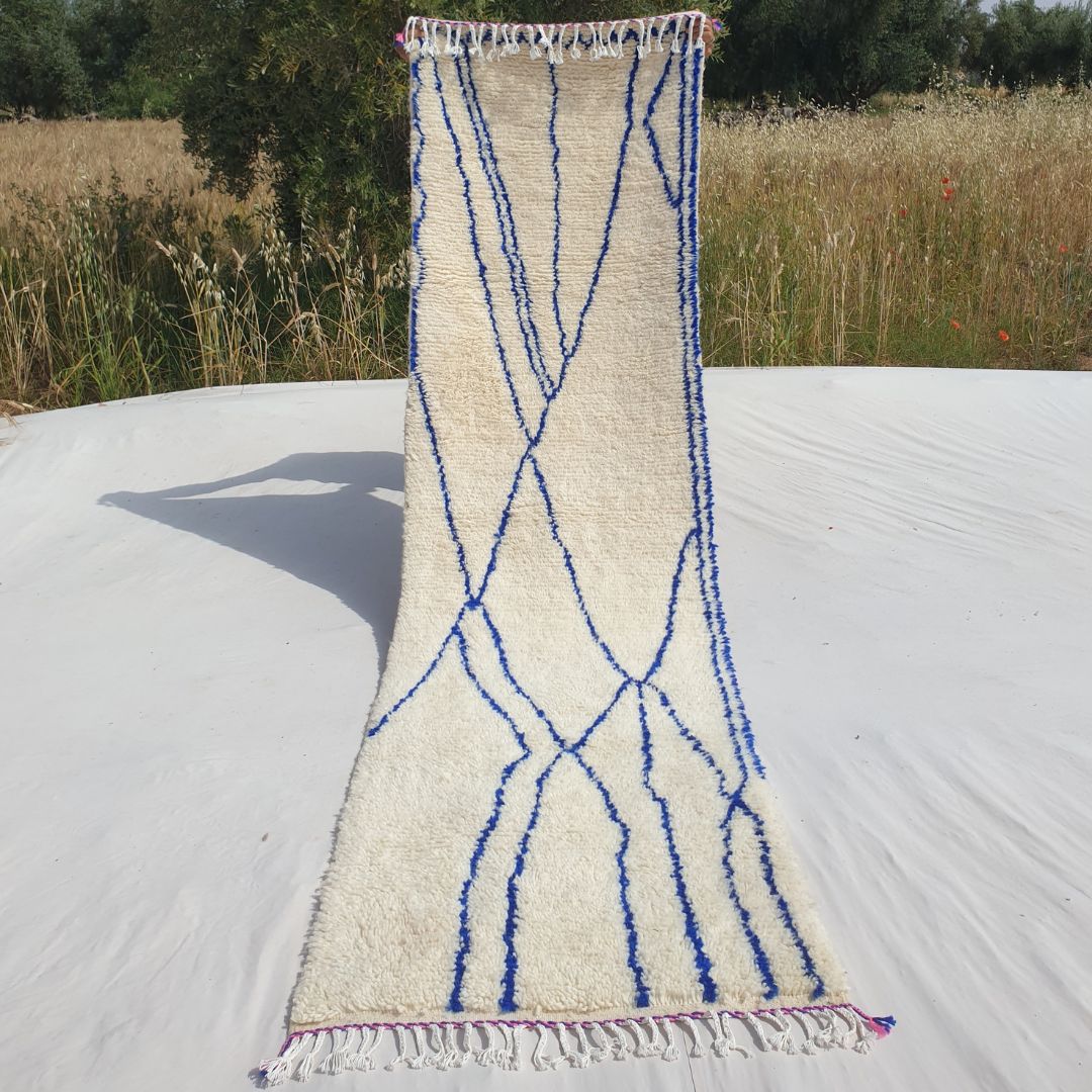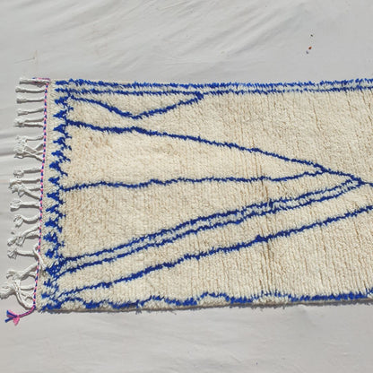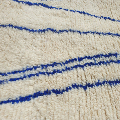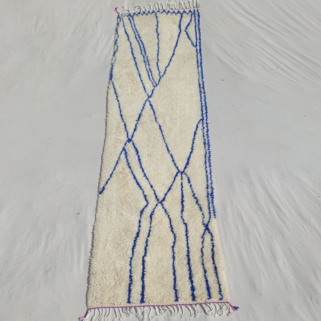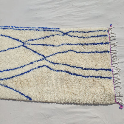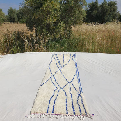 Elevate your narrow spaces with this Cream and Blue Moroccan Runner Rug, measuring 2'70x9'68 Ft | 82x295 cm. Handwoven in the Azilal tradition, this rug features a flowing abstract design with intersecting blue lines on a soft cream base. Perfect for hallways, entryways, or kitchens, its plush texture and artistic patterns make it an ideal addition to coastal, boho, or modern decor. This runner combines authentic Moroccan craftsmanship with a fresh, contemporary aesthetic, creating a versatile and stylish piece for your home.