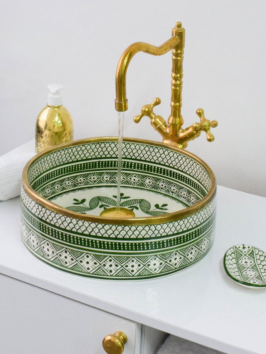 Dublin - Évier de vanité ronde marocaine avec bord en laiton - bassin de salle de bain en céramique fait à la main en vert - (Etat)