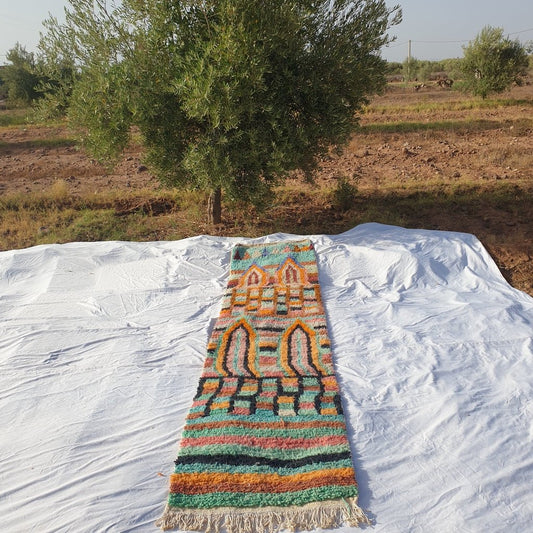 Tapis coureur marocain | Authentique coureur Boujaad | Tapis de laine coloré | Coureur berbère | Léger | Tapis de couloir | 10'1 x 2'3 pi | 307x 70 cm