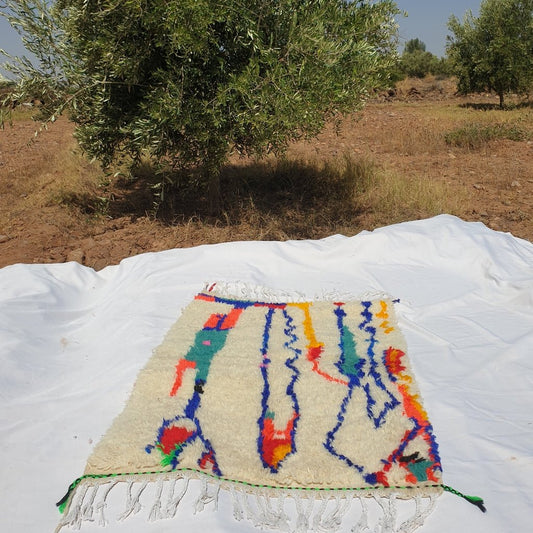 Tapis Blanc Marocain Azilal | YAYUKI | 4'7x3'3 pieds | 1,43x1,00 m | 100% laine fait main