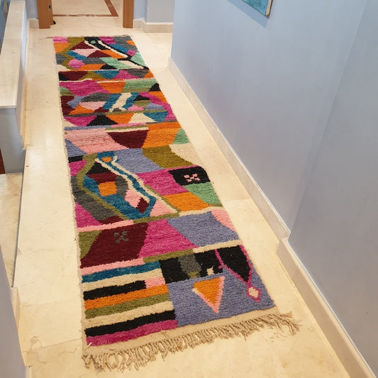 MOURI Coureur | 8'2x2'4 pieds | 2,50x0,74m | Tapis coloré marocain | 100% laine fait main