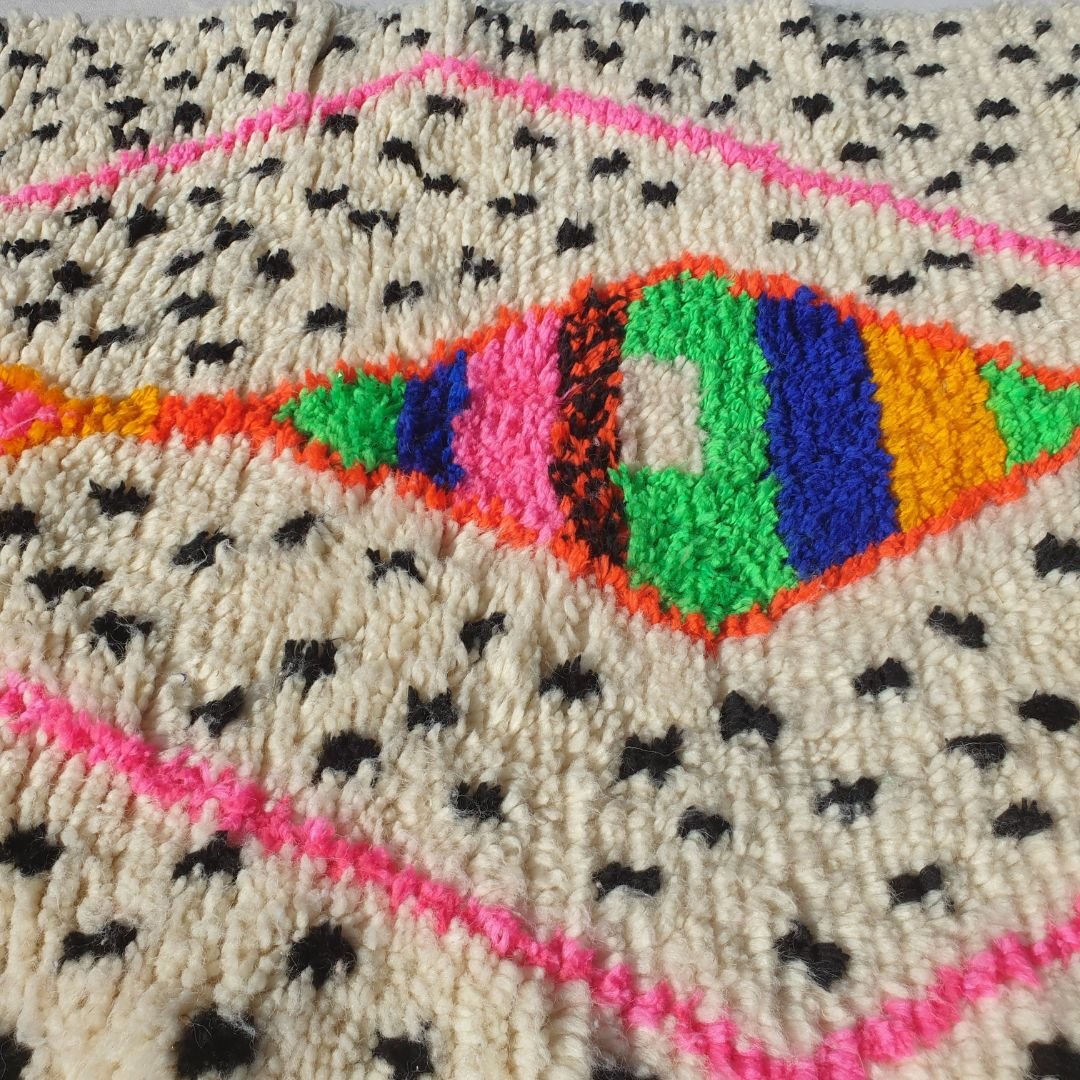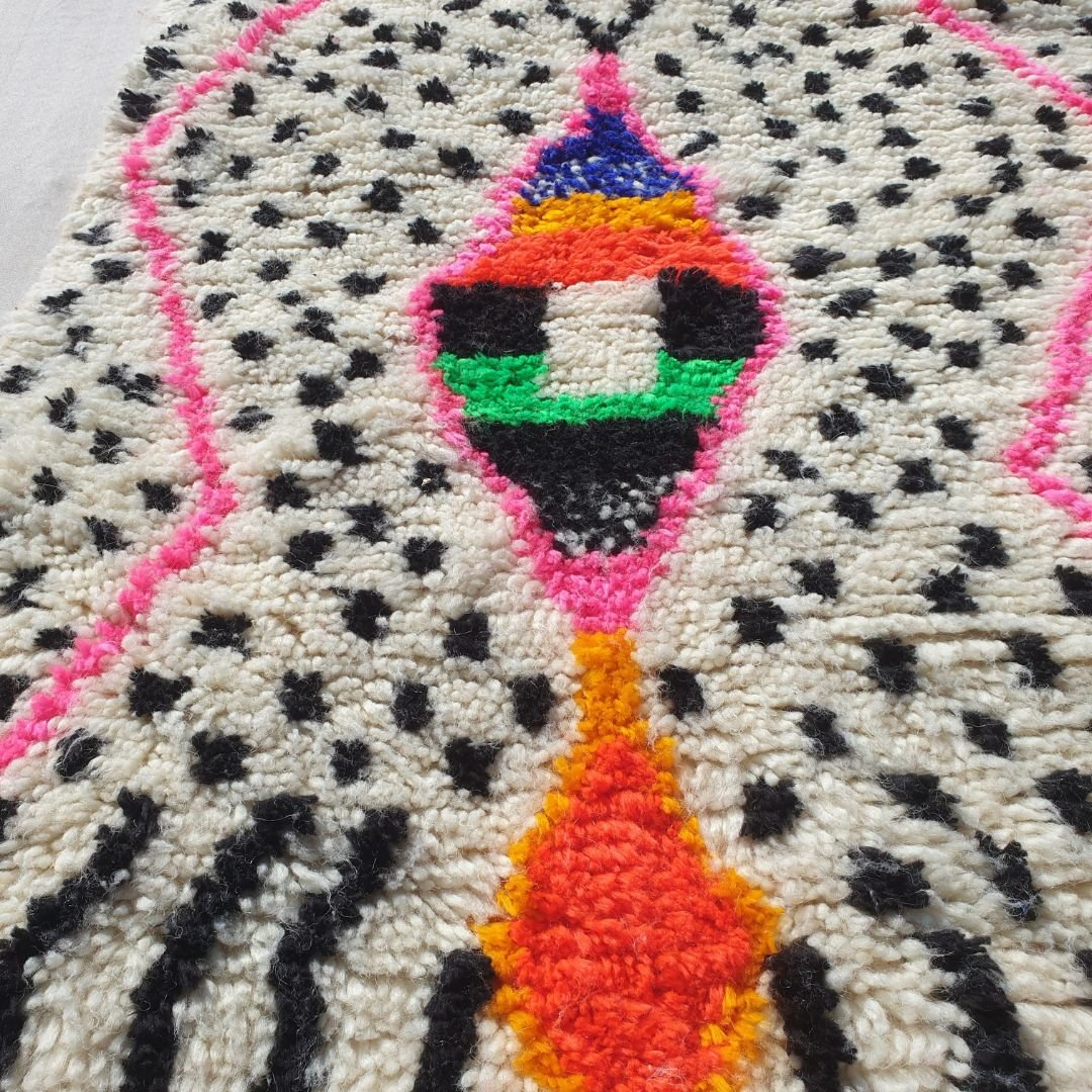Un tapis demande beaucoup de temps et d'efforts, mais il peut raconter une histoire de vie, celle d'une femme, quelque part dans le monde, qui tente d'améliorer sa vie et celle de ses enfants. Au cœur de tribu Azilal, situé à Demnat a région berbère marocaine, l'une des régions les plus riches des montagnes de l'Atlas, sont réalisées ces pièces d'art, inspirées des belles montagnes fleuries et des rivières qui coulent. Azilal, le tapis le plus beau et le plus coloré. fait à la main pour un usage personnel ou être un cadeau pendant la les longues nuits d'hiver. Le Tapis Azilal reflète la richesse de la région. Ce type de tapis traditionnel est généralement double face, moelleux et très chaud un côté pour l'hiver, l'autre côté est pour l'été.