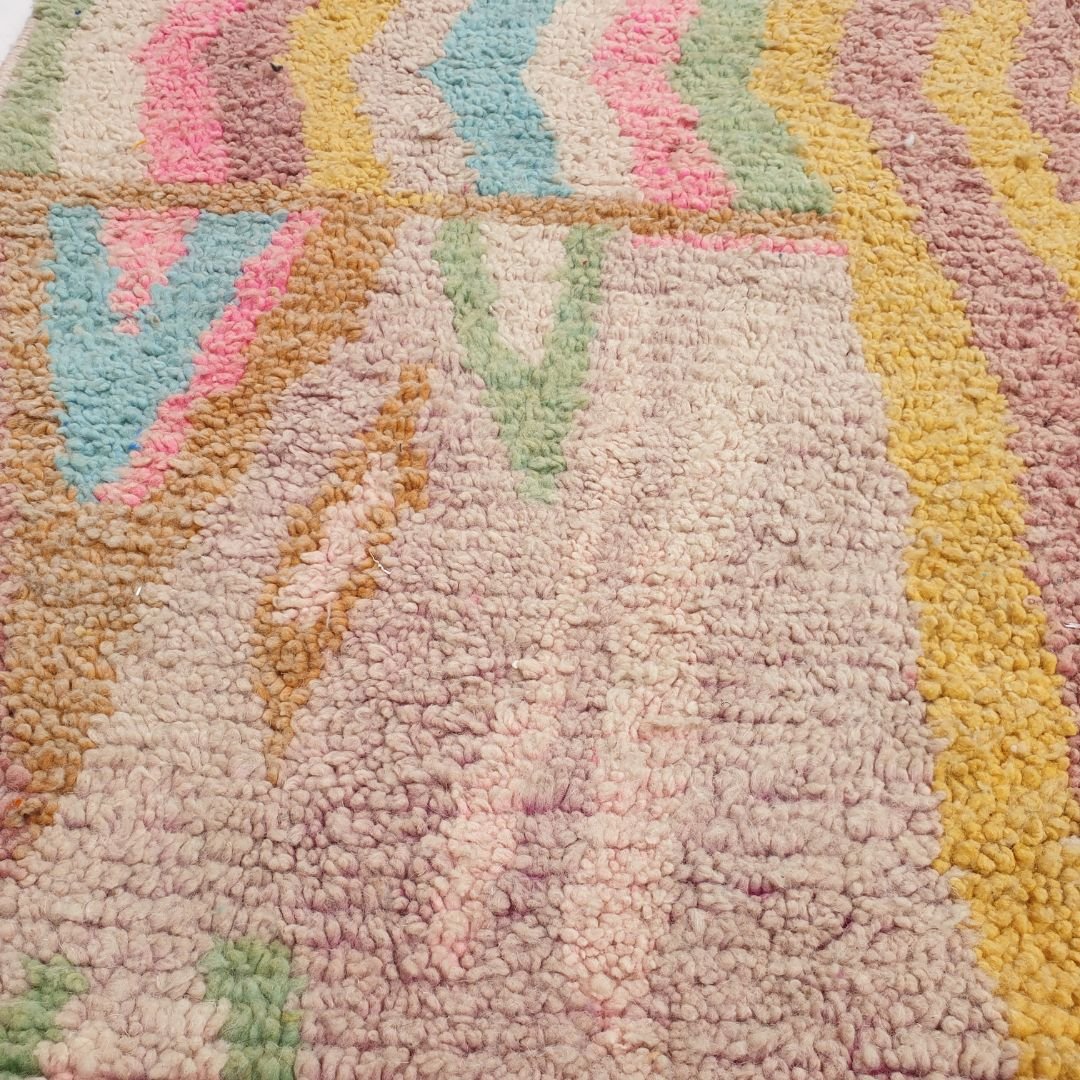 Tapis Boujad tissé à l'origine sur des métiers à tisser traditionnels par berbère femmes de l'Atlas marocain. Ces tapis sont tous fabriqués individuellement. fabriqué à la main, chaque tapis est spécial, unique et différent, et vous ne trouverez jamais le même motif. Ils sont fabriqués à partir de laine de mouton naturelle avec colorant naturel, et des techniques de nouage typiques pratiquées par les tribus berbères - mais avec le nœud plus serré, ces tapis nécessitent moins de laine, ce qui permet au tisserand de créer des motifs complexes motifs géométriques choses qui font Tapis Boujad célèbre et désiré dans le monde entier et parfait pour tout style intérieur ou extérieur.