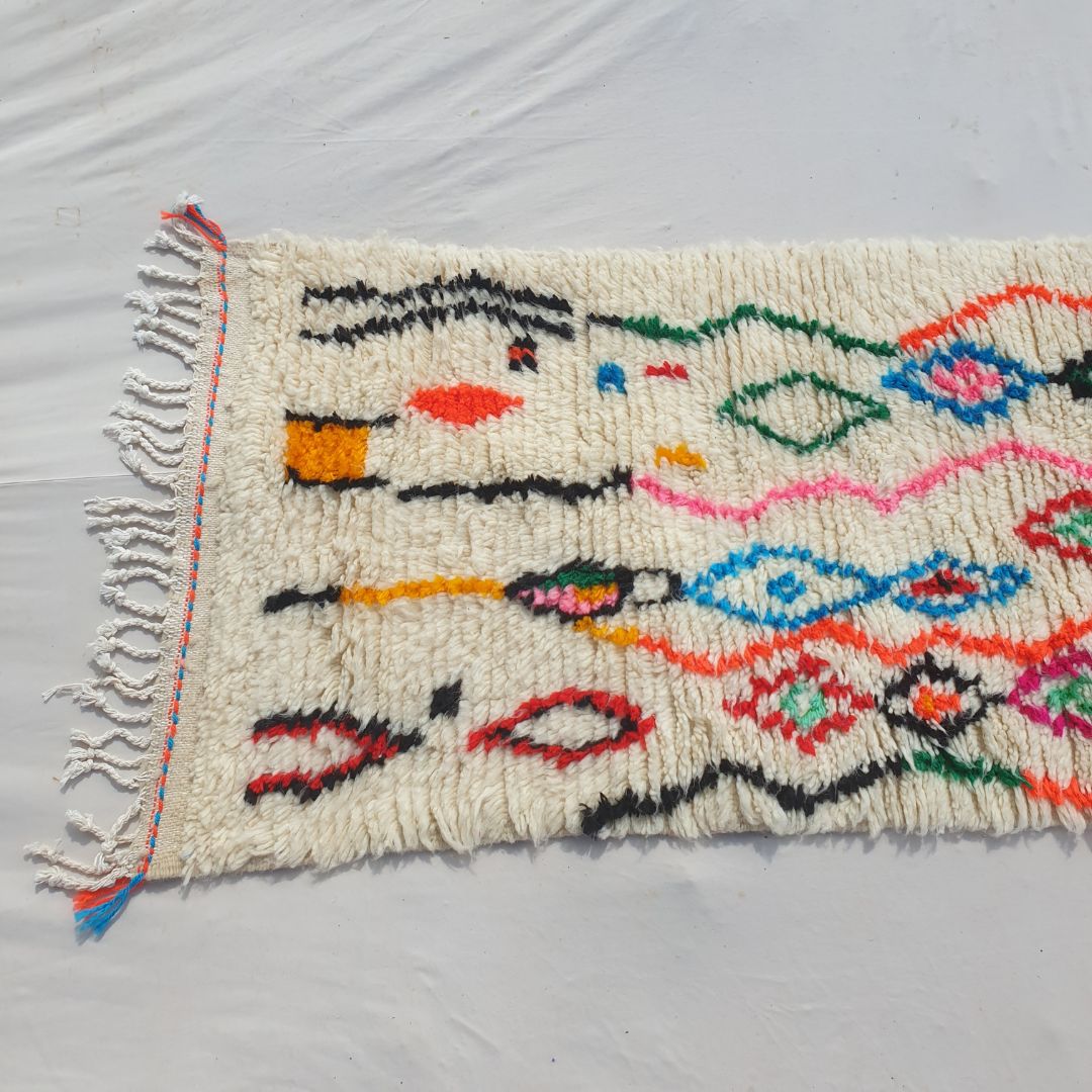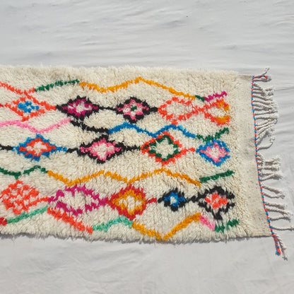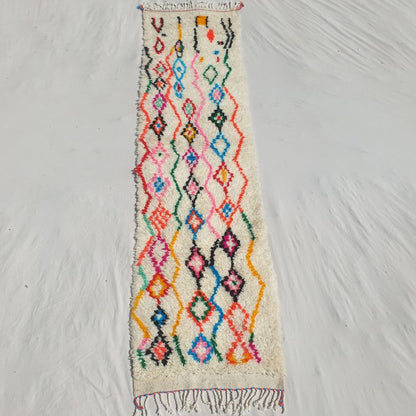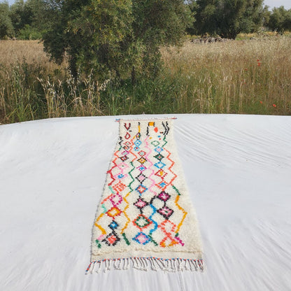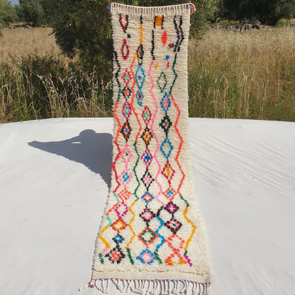 Brighten your narrow spaces with this Colorful Moroccan Runner Rug, measuring 2'40x9'42 Ft | 73x287 cm. Handwoven in the Azilal tradition, this rug features a vibrant diamond and zigzag design with bold hues of pink, blue, green, yellow, orange, and red on a soft cream base. Perfect for hallways, entryways, or kitchens, its plush texture and playful patterns make it an ideal addition to boho, eclectic, or children’s spaces. This runner blends authentic Moroccan craftsmanship with a lively, contemporary aesthetic, creating a cheerful and stylish piece for your home.