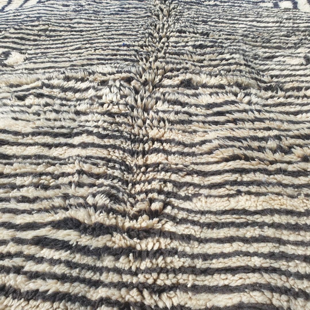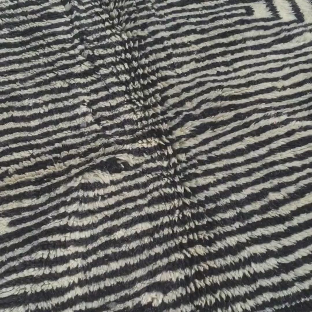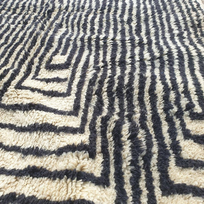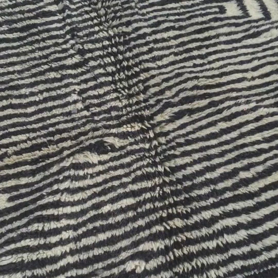 Add a touch of sophistication to your home with this modern black and white rug 6x9 for living room, a luxurious Beni Mrirt rug measuring 6x9 ft (184x277 cm). Handwoven by skilled artisans in the Middle Atlas Mountains of Morocco, this 6x9 area rug features a sleek black and white striped pattern with diamond accents, creating a striking area rug white and black that blends contemporary design with traditional craftsmanship. Crafted from natural wool, this wool rug 6x9 offers an ultra-soft, fluffy texture, making it a standout in our shag rug collection. Perfect for those seeking black and white rugs for living room or a luxury rug to elevate their space, this piece combines style and comfort seamlessly.