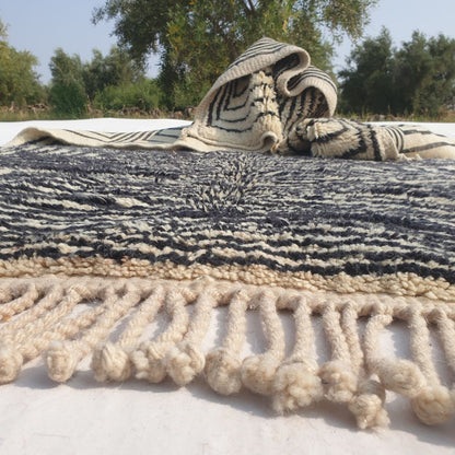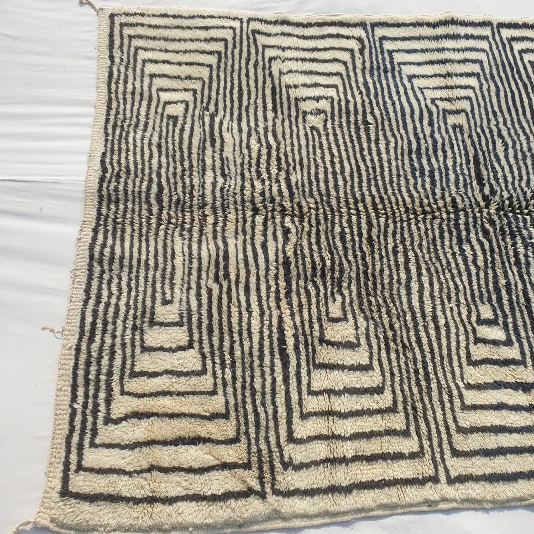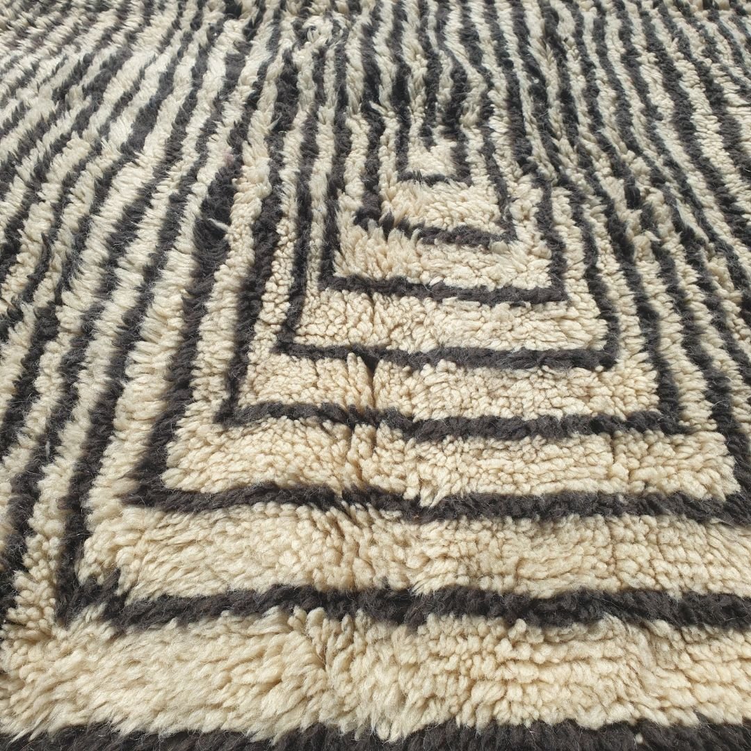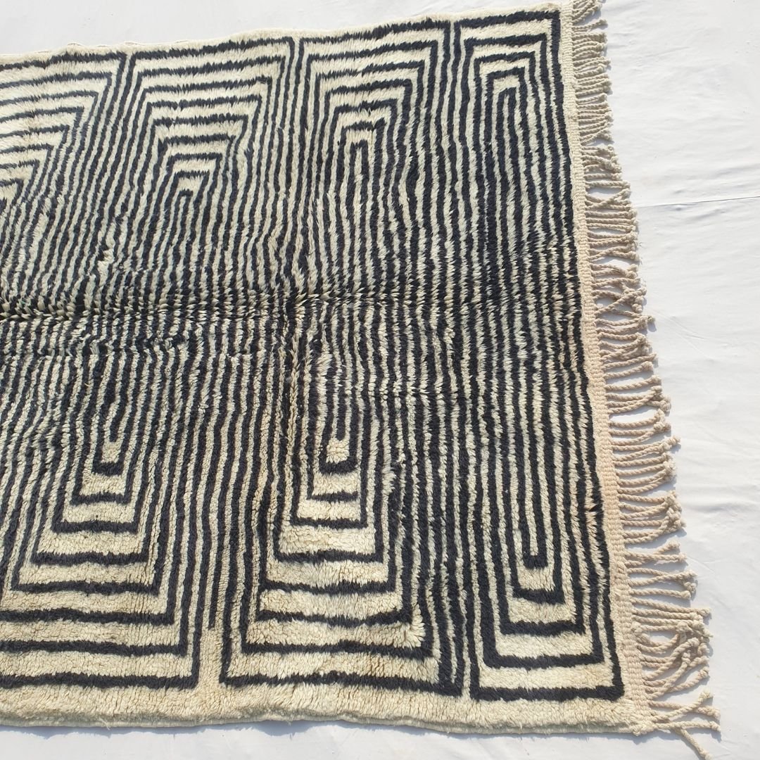 Add a touch of sophistication to your home with this modern black and white rug 6x9 for living room, a luxurious Beni Mrirt rug measuring 6x9 ft (184x277 cm). Handwoven by skilled artisans in the Middle Atlas Mountains of Morocco, this 6x9 area rug features a sleek black and white striped pattern with diamond accents, creating a striking area rug white and black that blends contemporary design with traditional craftsmanship. Crafted from natural wool, this wool rug 6x9 offers an ultra-soft, fluffy texture, making it a standout in our shag rug collection. Perfect for those seeking black and white rugs for living room or a luxury rug to elevate their space, this piece combines style and comfort seamlessly.