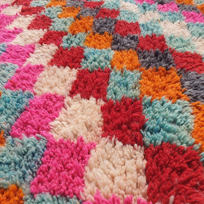 Brighten your home with this colorful checkered Moroccan rug 7x8 for living room, a luxurious Beni Mrirt rug measuring 6'96x7'87 Ft | 212x240 cm. Handwoven by skilled artisans in the Middle Atlas Mountains of Morocco, this checkered area rug features a vibrant multicolored checkerboard rug pattern with shades of red, orange, yellow, teal, and gray on a cream base, creating a playful yet elegant aesthetic. Crafted from natural wool, this wool berber rug offers an ultra-soft, fluffy texture, making it a standout in our shag rug collection. Perfect for those seeking colorful rugs for living room or a Moroccan style rug to add a bohemian flair, this piece combines bold design with exceptional comfort.