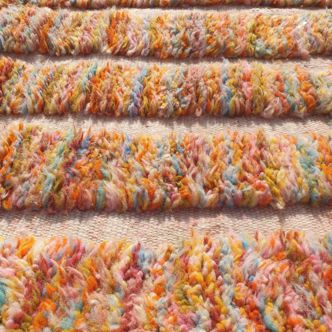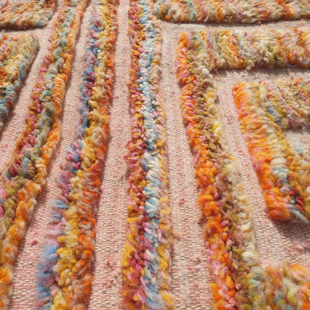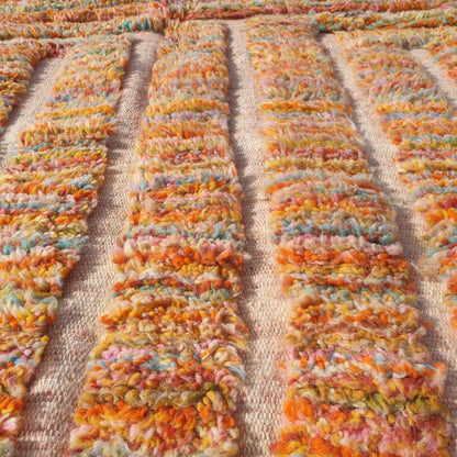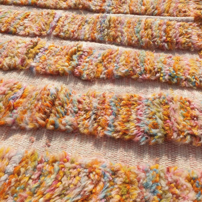 While both are Moroccan shag rug styles, Beni Ourain rugs are distinguished by their use of undyed or naturally dyed wool, often in neutral or soft tones with simple patterns. In contrast, Beni Mrirt rugs feature more vibrant colors and intricate designs, reflecting a different tribal aesthetic. This pink orange rug aligns with the Beni Ourain tradition but with a modern twist, making it a unique orange Moroccan rug option. Learn more about rug care at How to Clean Moroccan Rugs.
