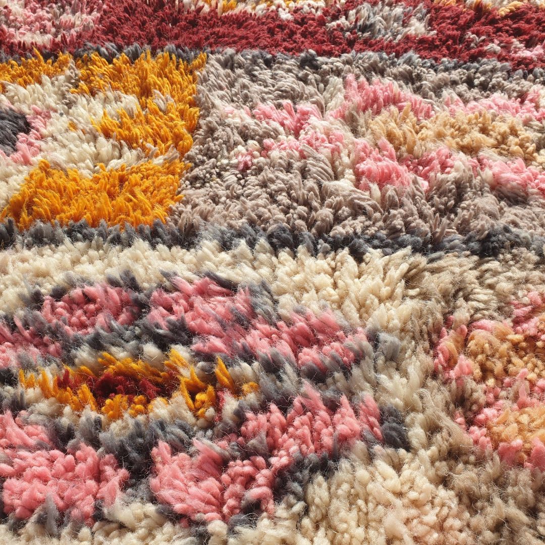 The Berber women pack the wool on the vertical loom using a metal comb, which results in a fine and silky texture of the wool that just feels heavenly on the foot, the Mrirt rugs are the most expensive due to the high quality and the quantity of the wool we use.