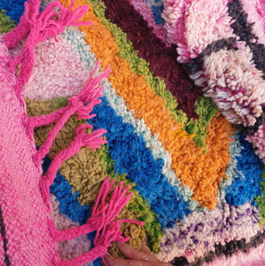 Boujaad, the Amazing Berber lightweight’s rug. The design is Inspired from the Kilim rugs. Named also Hanbal, because of its Boho, Modern, Scandinavian, and traditional Berber Moroccan style, it has only one side, it is usually used for floors or to decorate the walls of the interiors.