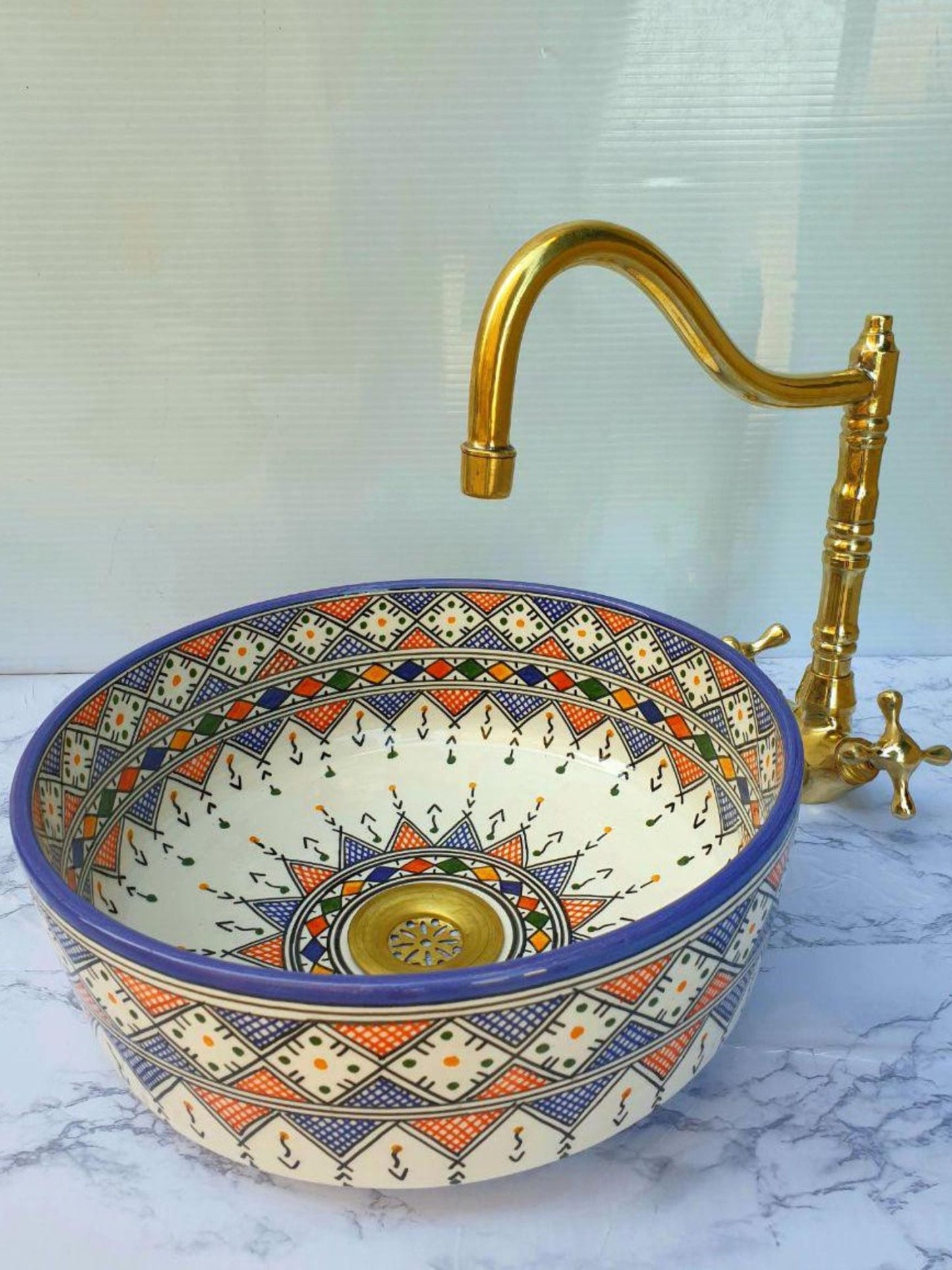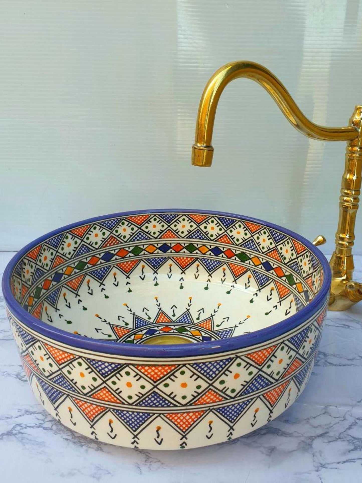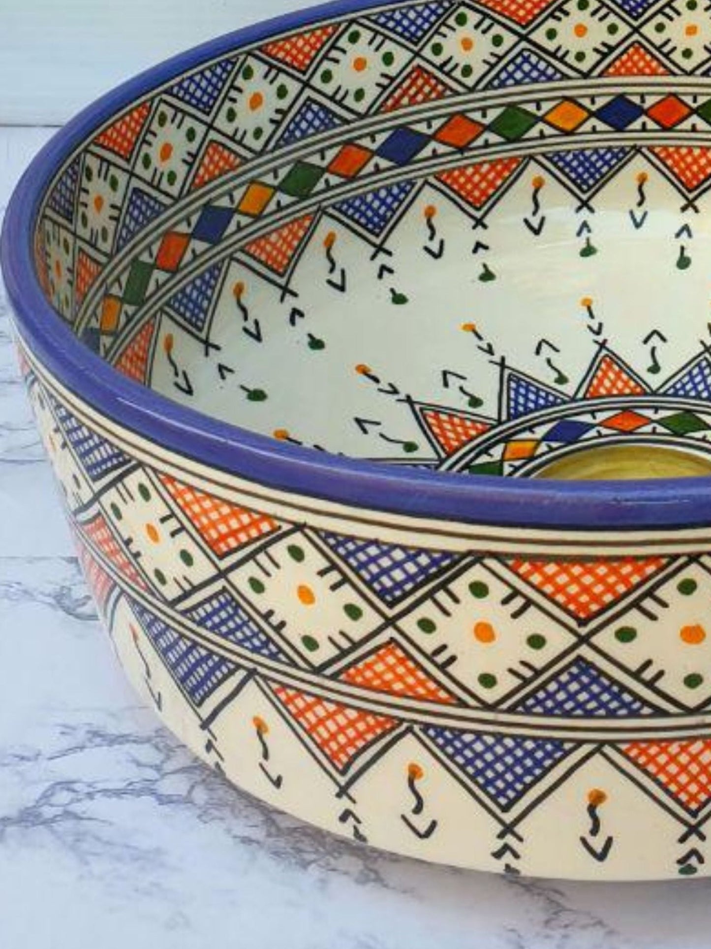 Budapest - Handmade Moroccan Round Ceramic Sink – Blue and Orange Geometric Top Counter Vessel Sink - (ETFS)