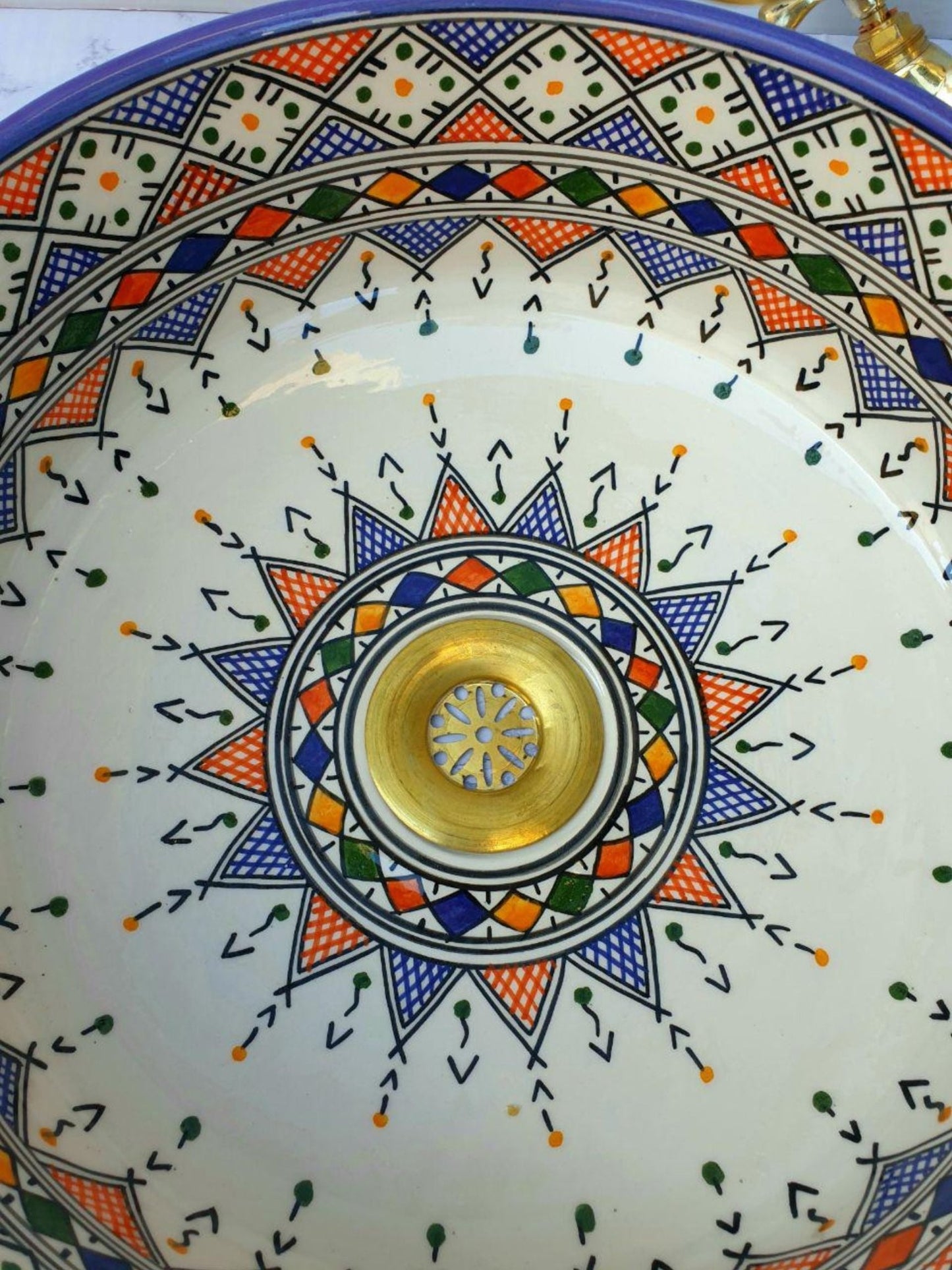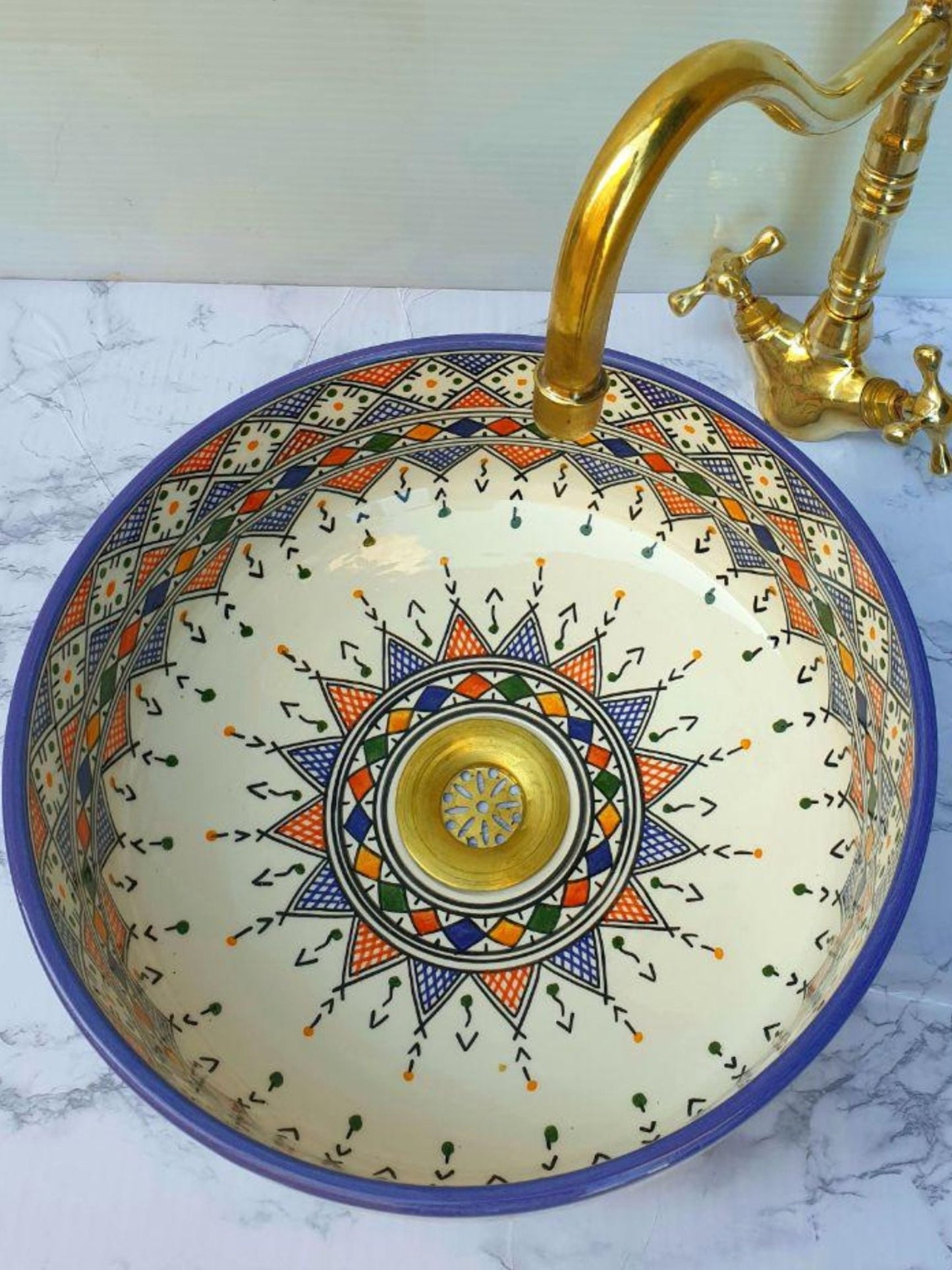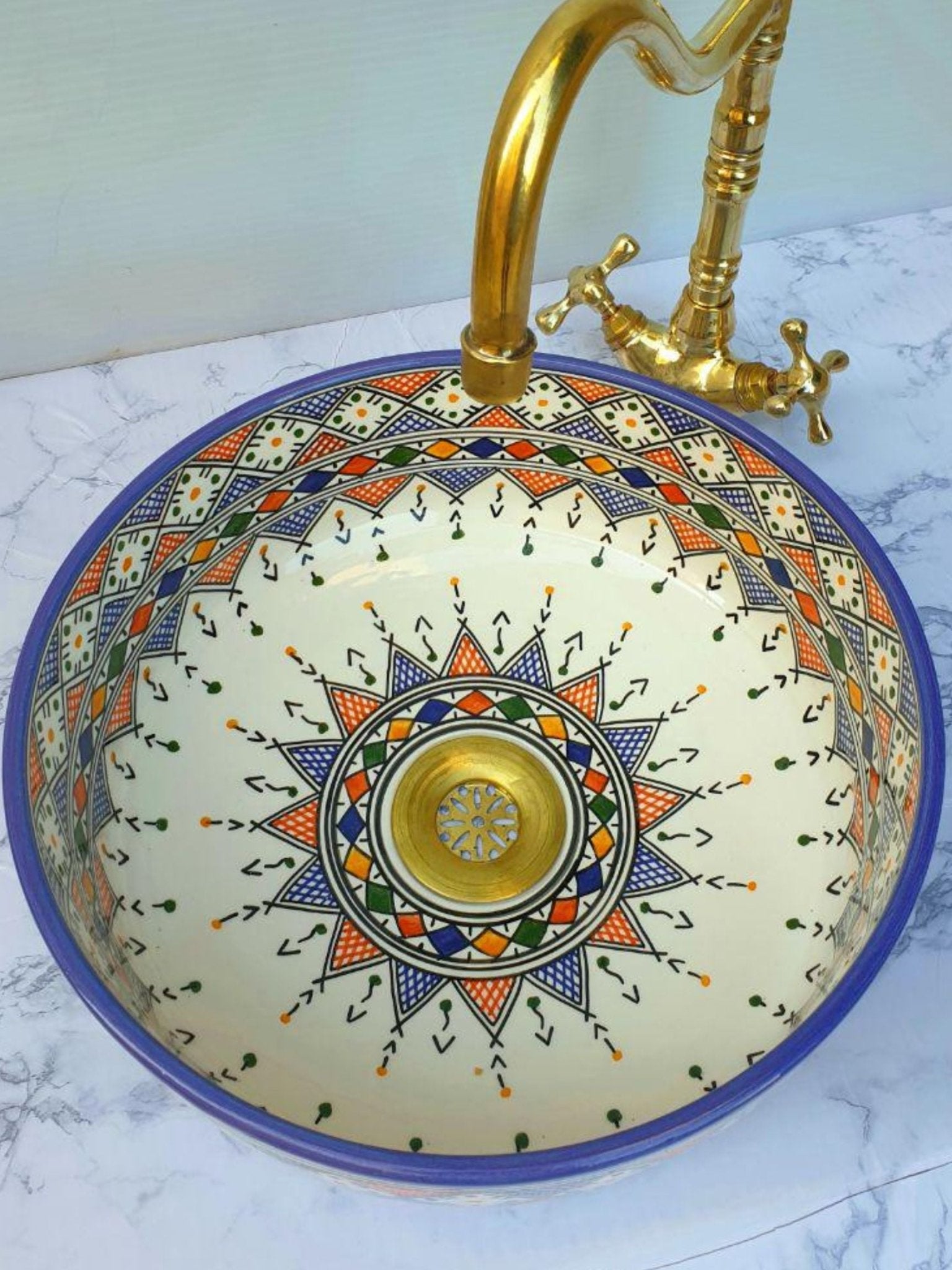 Budapest - Handmade Moroccan Round Ceramic Sink – Blue and Orange Geometric Top Counter Vessel Sink - (ETFS)
