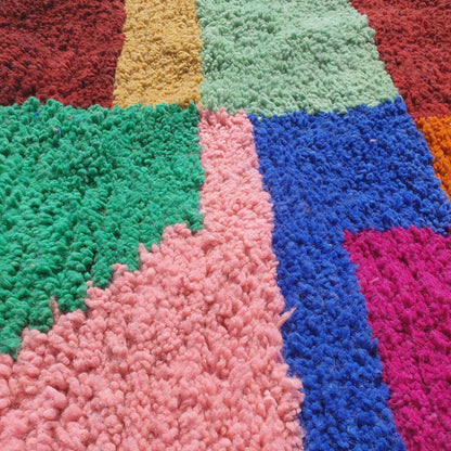 Brighten your space with this Colorful Boujad Moroccan Rug, measuring 5x8 ft (152x244 cm). Handwoven by skilled artisans, this soft and vibrant rug features a stunning patchwork-style design with bold hues of pink, blue, green, orange, yellow, and red. Perfect for adding a pop of color to a bedroom, nursery, or eclectic living space, its plush texture and artistic patterns make it a true statement piece. Ideal for boho, modern, or playful decor, this rug brings warmth and creativity to any home.