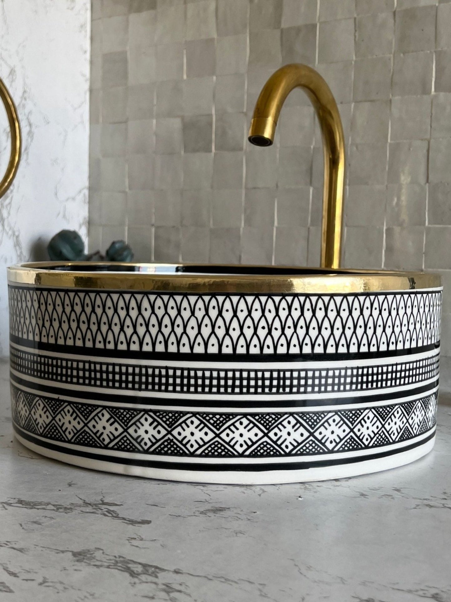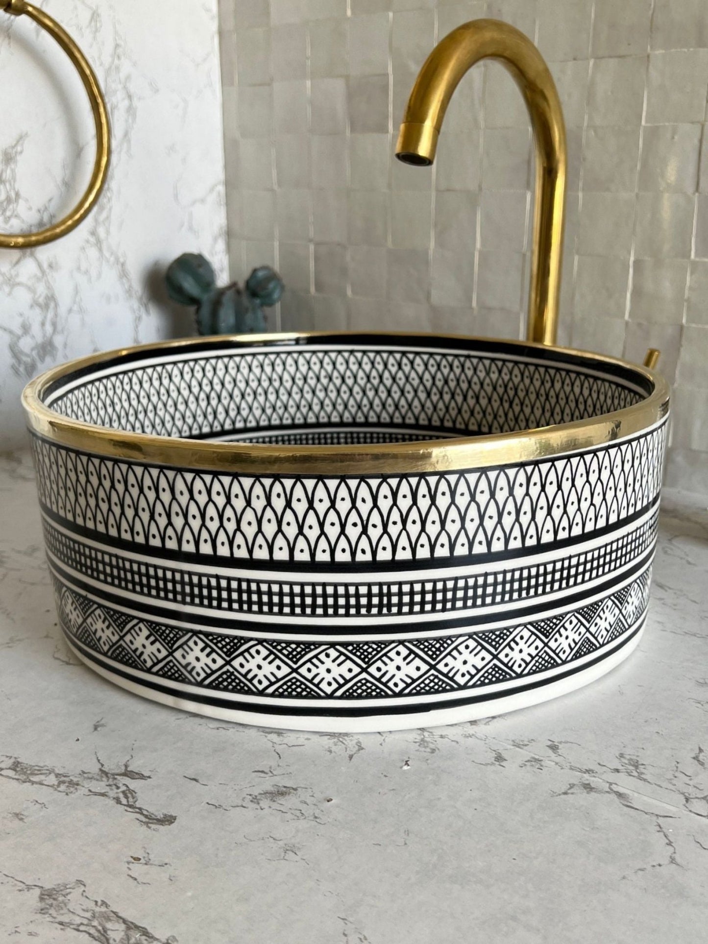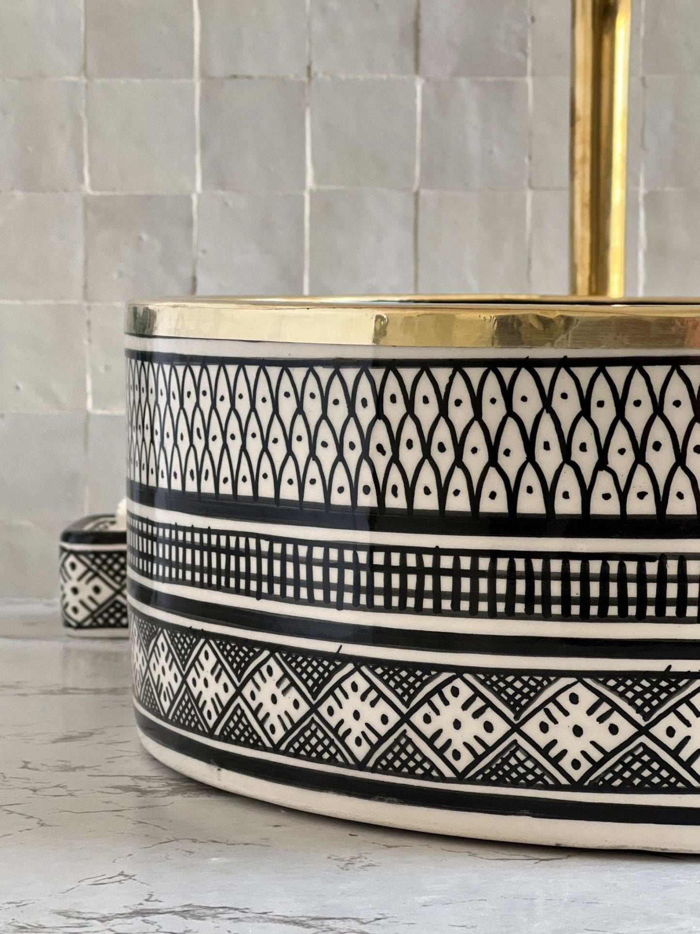 Istanbul - Handmade Moroccan Ceramic Sink – Black and White With Brass Rim Elegant Bathroom Vessel Sink - (ESEN)