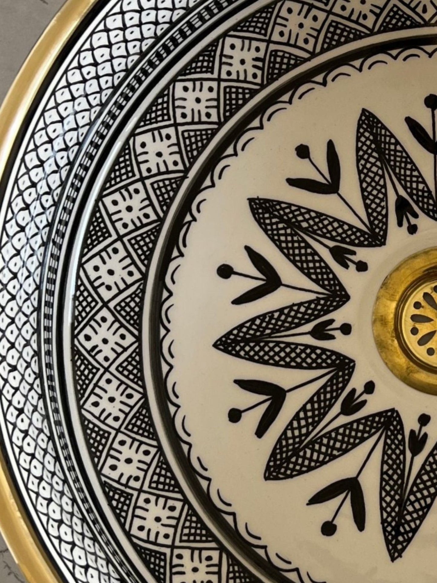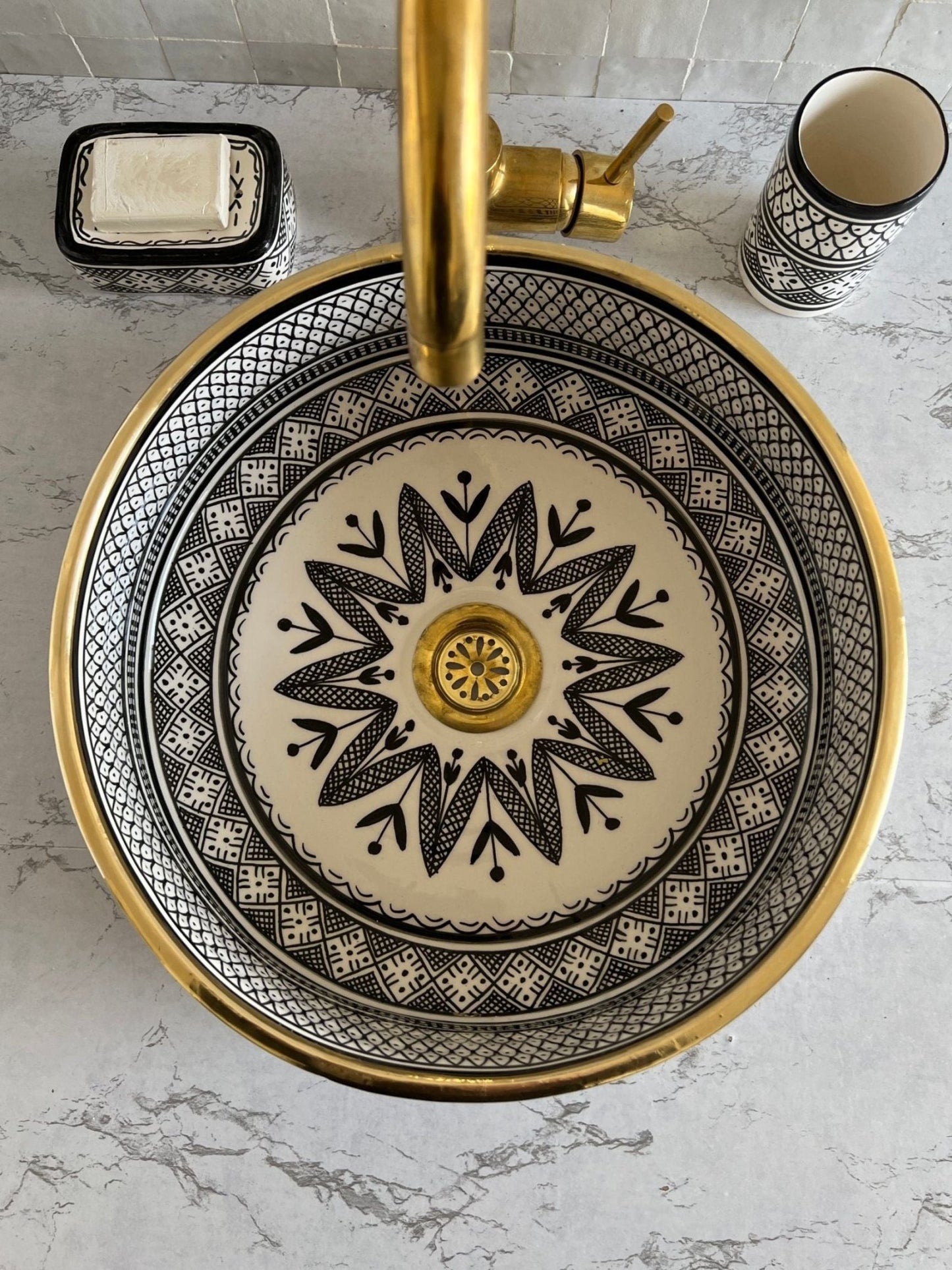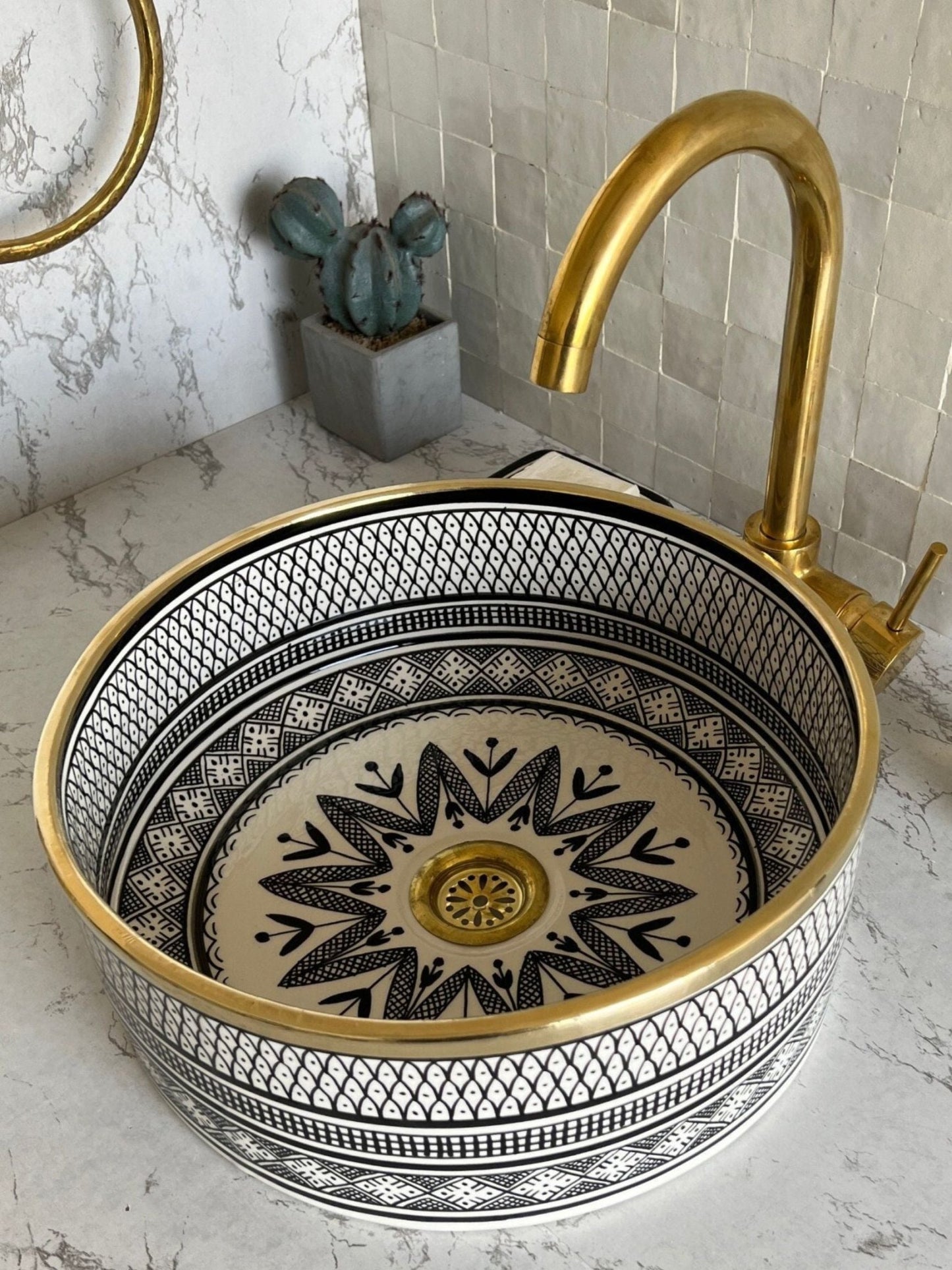 Istanbul - Handmade Moroccan Ceramic Sink – Black and White With Brass Rim Elegant Bathroom Vessel Sink - (ESEN)