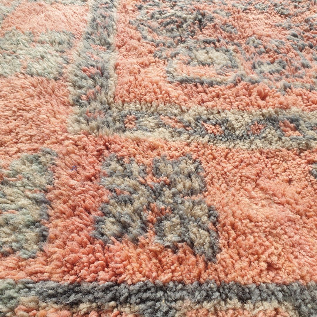 Elevate your space with this Peach Beni Mrirt Moroccan Rug, measuring 6'86x10'10 Ft | 209x308 cm. Handwoven with exceptional care, this newly made rug boasts a vintage-style design with intricate grayish-blue patterns set against a warm peach background. Known for being the most luxurious type of Moroccan rug, its ultra-soft, plush, and dense texture offers unparalleled comfort. Perfect for a living room, dining area, or boho-inspired space, this rug combines timeless elegance with modern craftsmanship, making it a stunning focal point for any home.