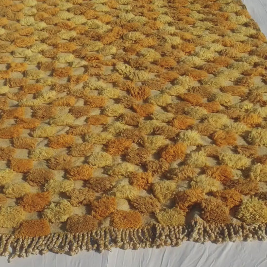 Elevate your living space with our stunning yellow Moroccan rug, a 6x9 ft masterpiece handcrafted by the skilled artisans of the Middle Atlas Mountains in Morocco. This 6x9 rug blends traditional Berber design with modern aesthetics, featuring a vibrant mustard yellow rug hue accented with intricate white patterns. Crafted from 100% natural dyed wool, this Moroccan shag rug offers unmatched softness and durability, making it perfect as a yellow rug living room centerpiece or a cozy 6x9 bedroom rug. Shop now at our Moroccan rug collection!