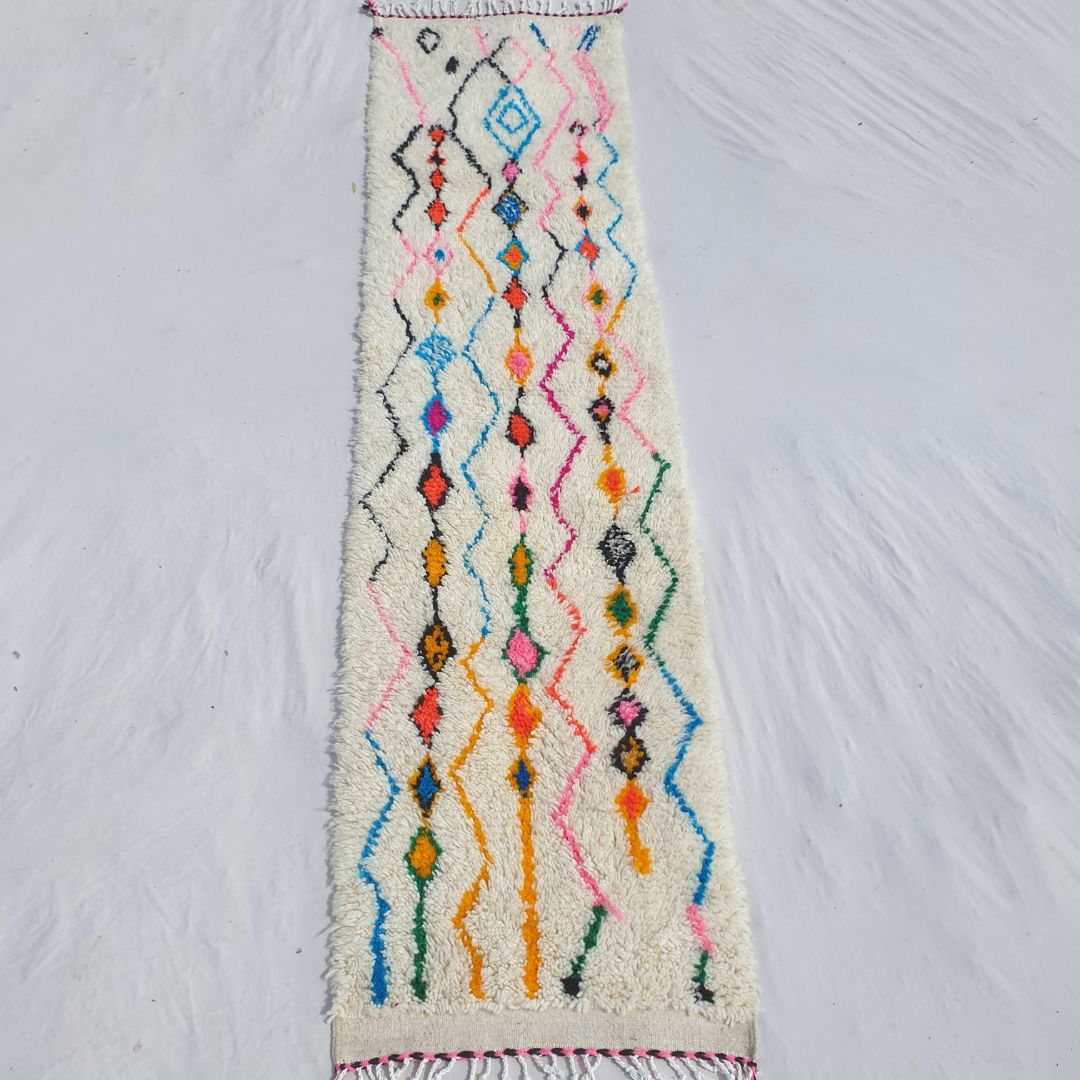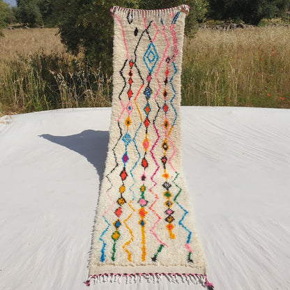 Infuse your space with bohemian charm using this Handwoven Bohemian Moroccan Runner Rug, measuring 2'46x9'94 Ft | 75x303 cm. Crafted in the Azilal tradition, this multicolored runner features a lively diamond and zigzag design with vibrant hues of pink, blue, green, yellow, orange, and red on a soft cream base. Perfect for entryways, hallways, or kitchens, its plush texture and eclectic patterns make it a stunning addition to bohemian or eclectic decor. This handwoven piece combines authentic Moroccan artistry with a bold, contemporary flair, creating a unique focal point for your home.