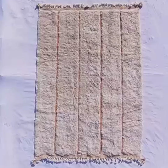 Infuse your home with gentle warmth and timeless style using our beautiful Beni Ourain Moroccan rug, a perfectly sized 6x9 ft handwoven treasure from the Ait Ouarain tribe in Morocco's Middle Atlas Mountains. This 6x9 rug showcases a pure ivory wool base crossed by soft warm orange vertical lines, creating a subtle, inviting Berber pattern. Crafted entirely from 100% natural undyed wool, it provides exceptional fluffiness and everyday resilience — your ideal plush shag carpet or welcoming 6x9 bedroom rug. Browse the full selection at our Moroccan rug collection!