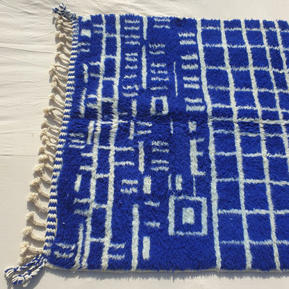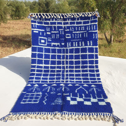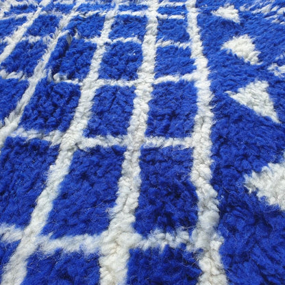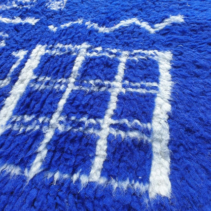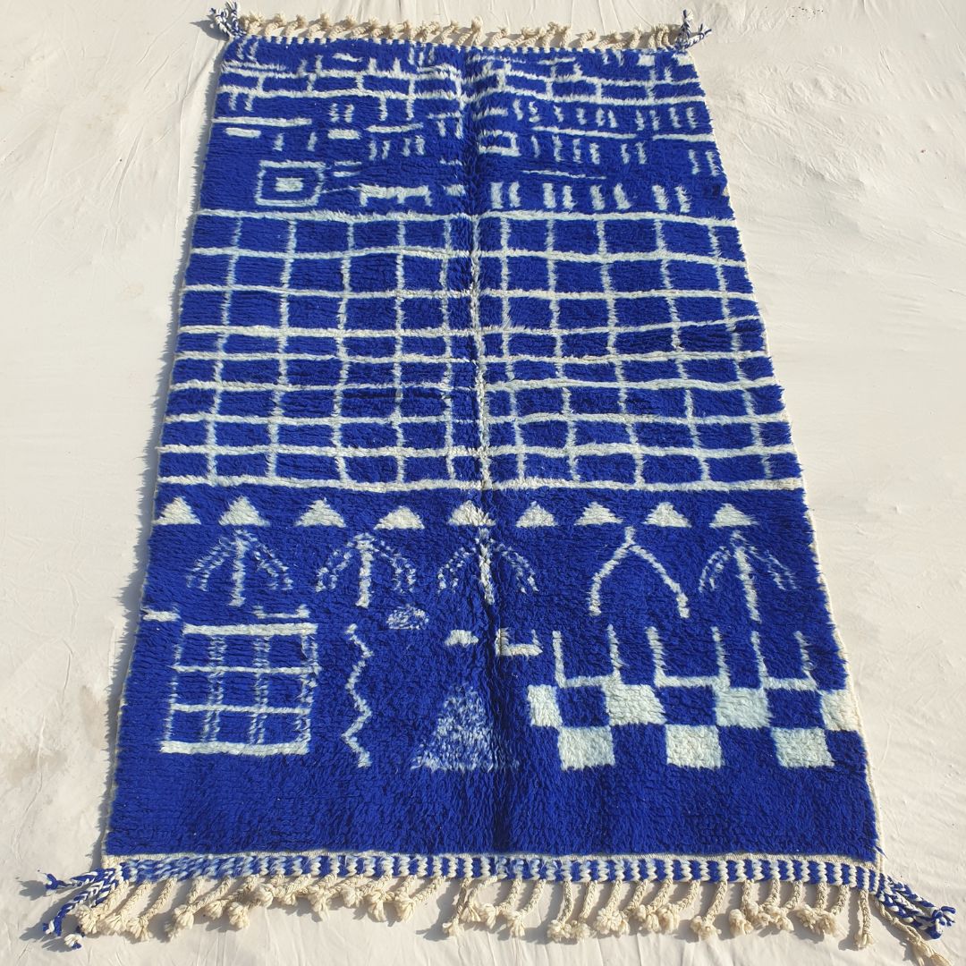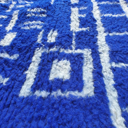 Infuse your home with timeless elegance using this stunning navy blue Moroccan rug, a 5x8 ft handwoven masterpiece from the Middle Atlas Mountains of Morocco. This 5x8 rug showcases a rich navy blue base with intricate white geometric and tribal patterns, epitomizing the allure of a moroccan shag rug. Crafted from 100% natural dyed wool, it’s an excellent 5x8 bedroom rug or rug living room centerpiece, blending durability with plush comfort. Browse more at our Moroccan rug collection!