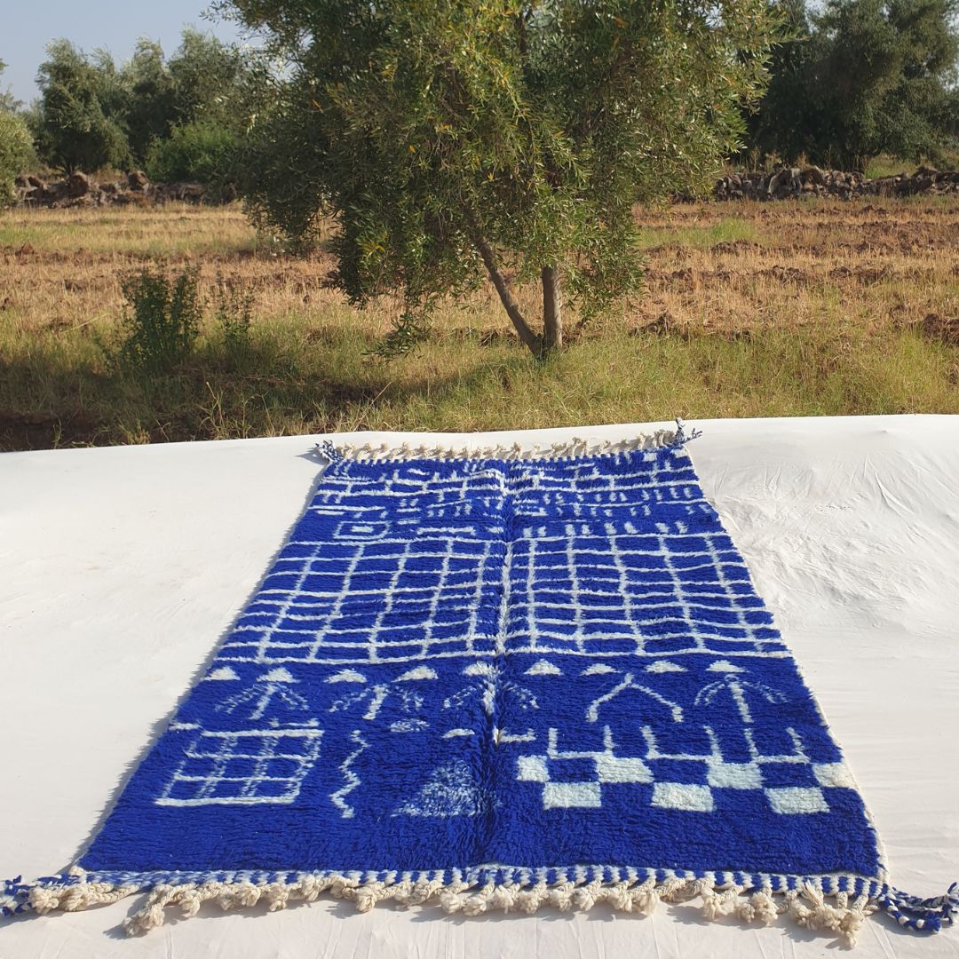 This navy blue Moroccan rug is a unique piece, with only 1 available. Customize your own design, size, or color for a personalized 5x8 living room rug by contacting us. Enjoy free worldwide shipping via DHL or FedEx, with payment options including PayPal, Visa, Mastercard, AMEX, Apple Pay, Sezzle Installments, or bank transfer. Wholesale deals are available for orders of 5+ rugs—inquire within!