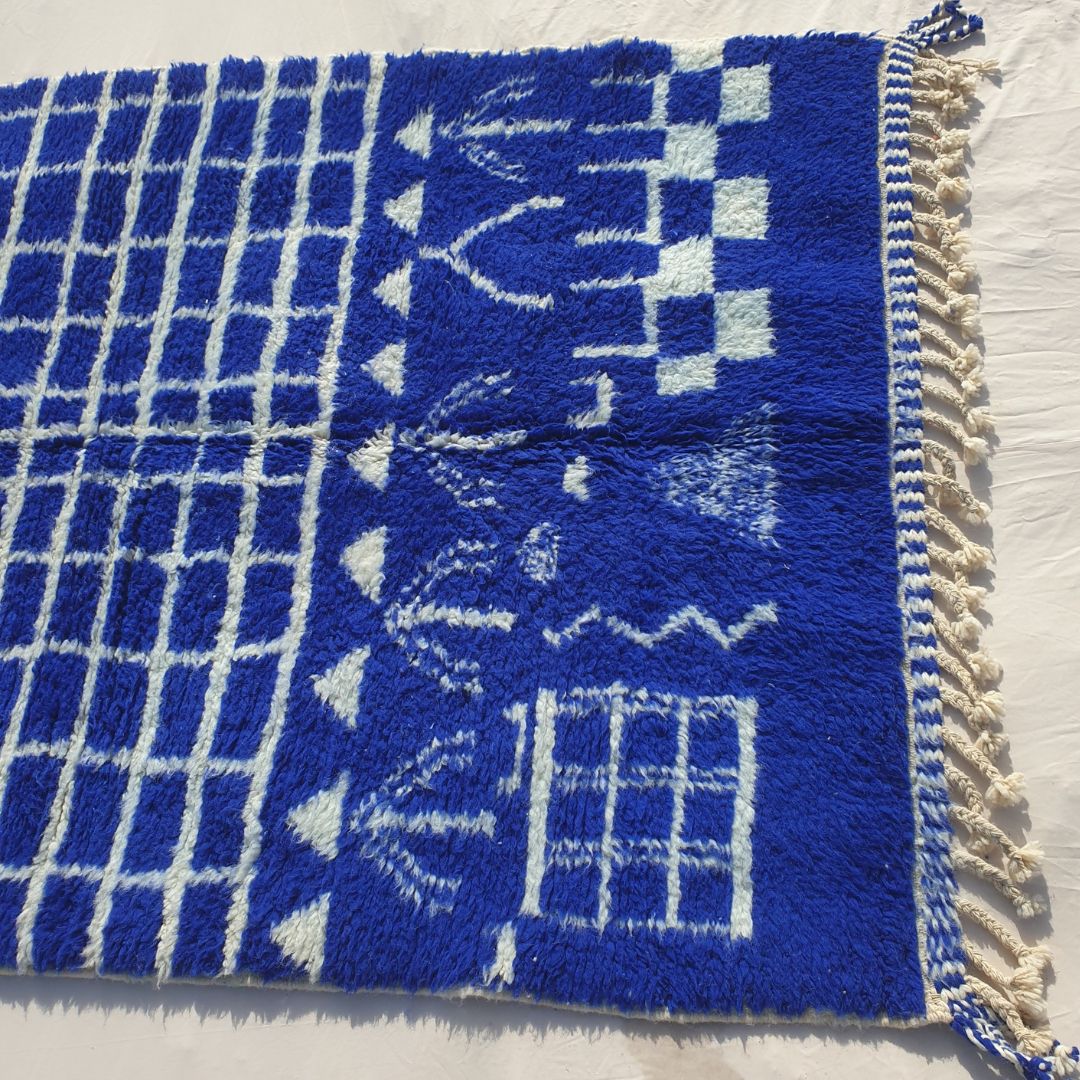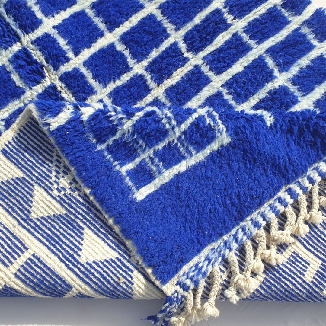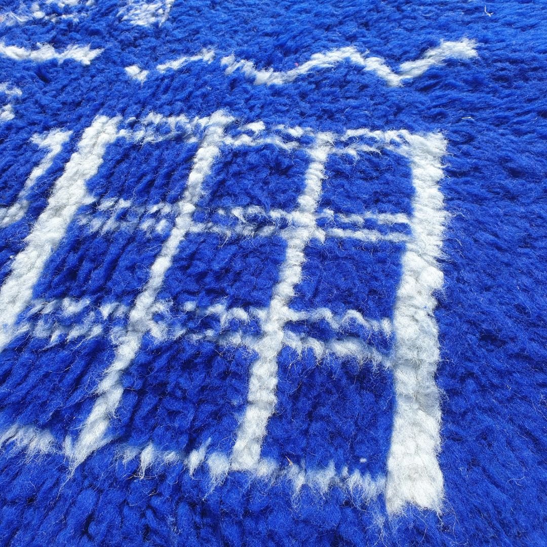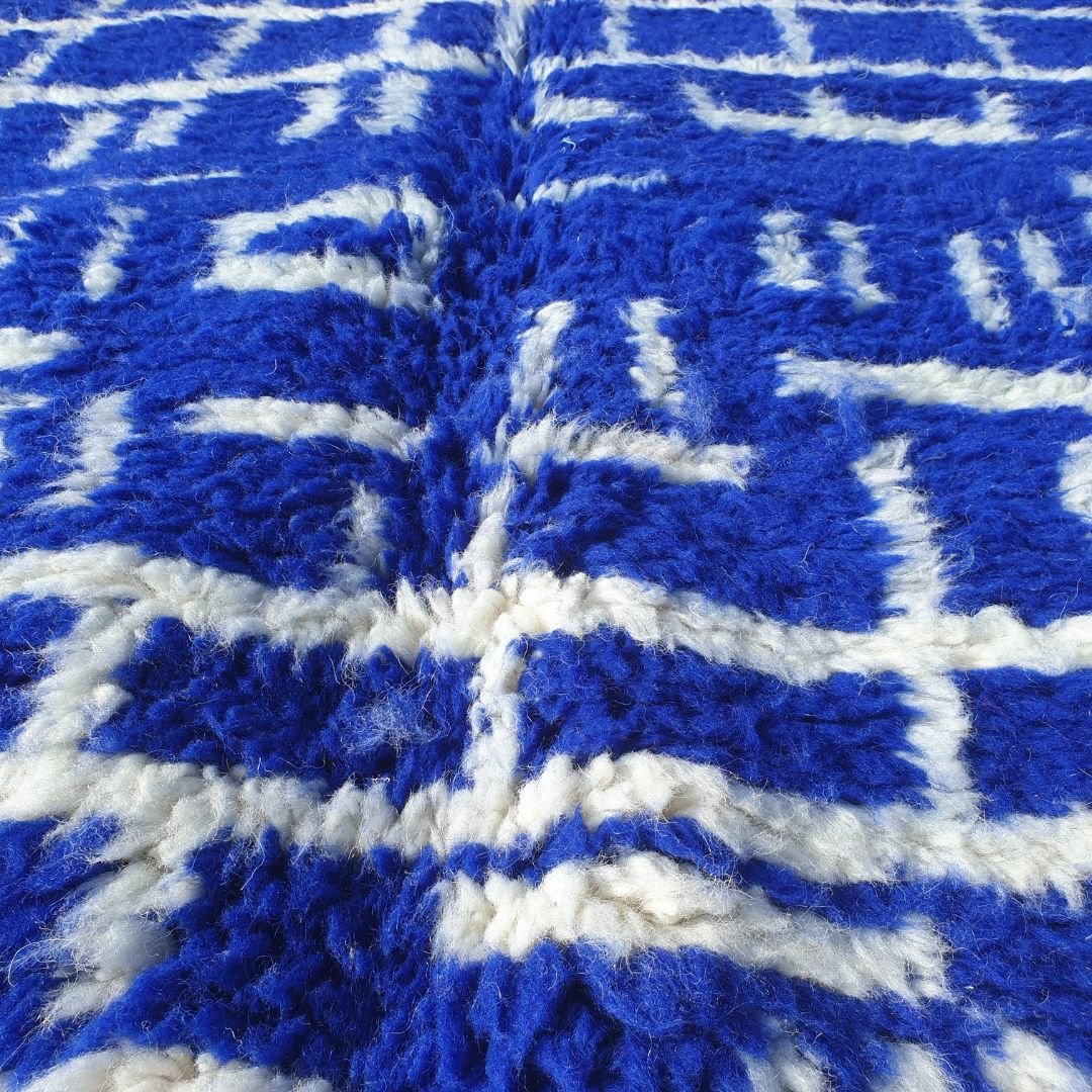 Beni Ourain rugs, like this morocco rug, feature soft, thick wool with abstract designs, ideal for a shag carpet rug texture. Beni Mrirt rugs, however, display bolder geometric patterns with thinner weaves, reflecting their unique heritage. This rug’s navy blue richness stands out. Check care tips at our cleaning guide.