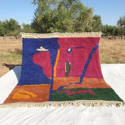 This red and blue Moroccan rug is a unique piece, with only 1 available. Customize your own design, size, or color for a personalized 5x8 living room rug by contacting us. Enjoy free worldwide shipping via DHL or FedEx, with payment options including PayPal, Visa, Mastercard, AMEX, Apple Pay, Sezzle Installments, or bank transfer. Wholesale deals are available for orders of 5+ rugs—inquire within!