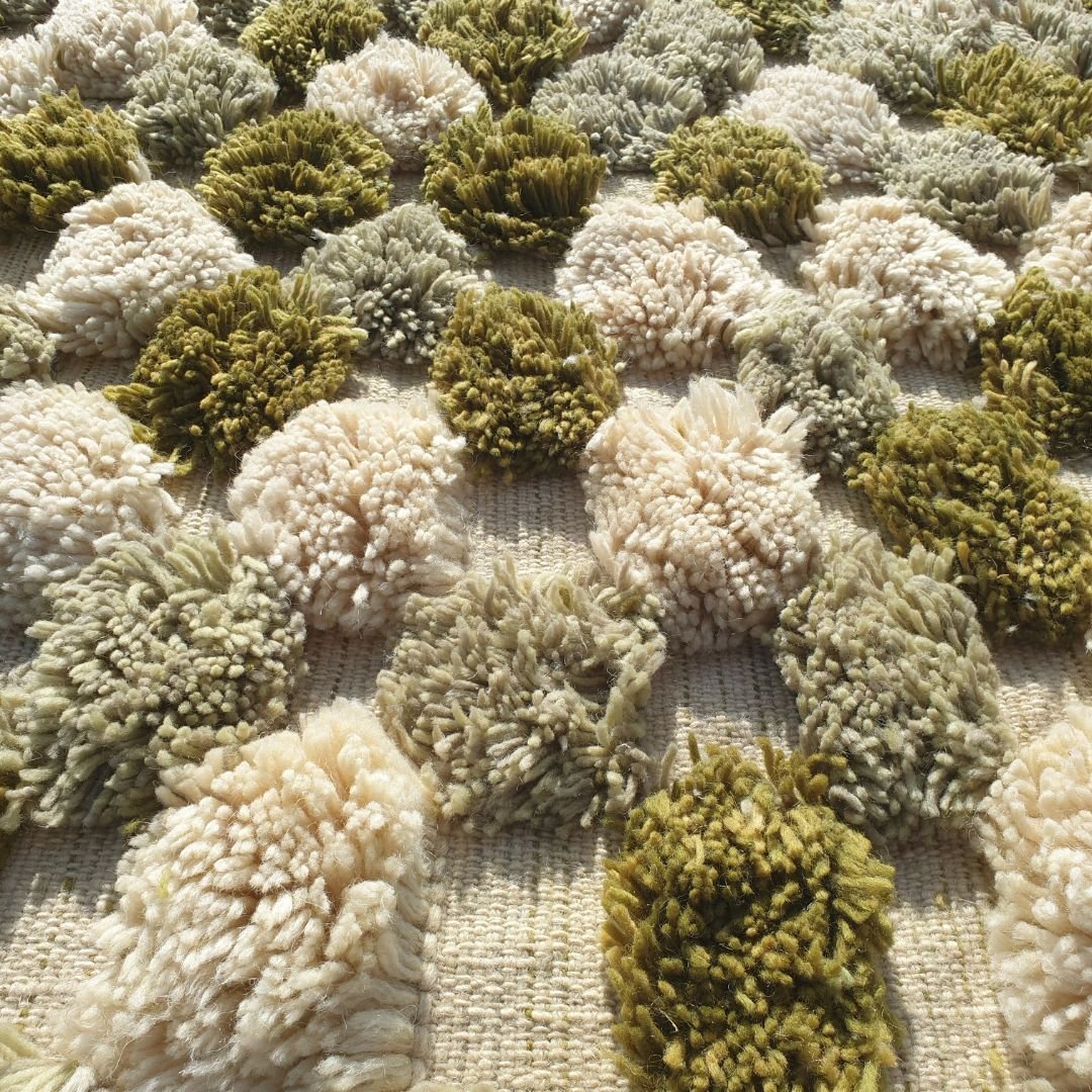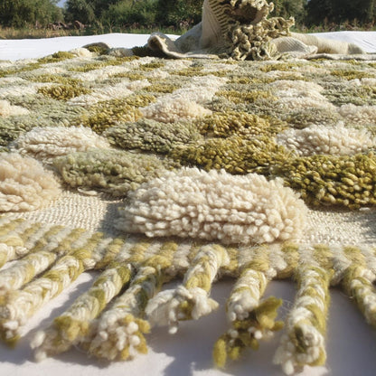 While both Beni Ourain and Beni Mrirt are iconic Moroccan rugs, they differ in design and craftsmanship. Beni Ourain rugs, known for their minimalist geometric patterns and creamy neutral tones, are typically lighter and less dense. In contrast, Beni Mrirt rugs feature a thicker, shaggier pile with vibrant colors like sage green, reflecting a more luxurious and robust construction. The Beni Mrirt’s double-knotted technique and higher wool content make it a luxury shaggy rug, ideal for those seeking a fluffy rug for bedroom with added warmth and durability. Explore more at our Beni Ourain Rug and Beni Mrirt Rugs collections.