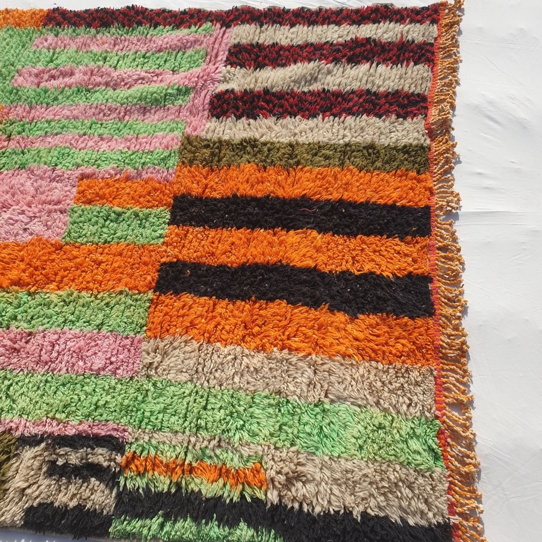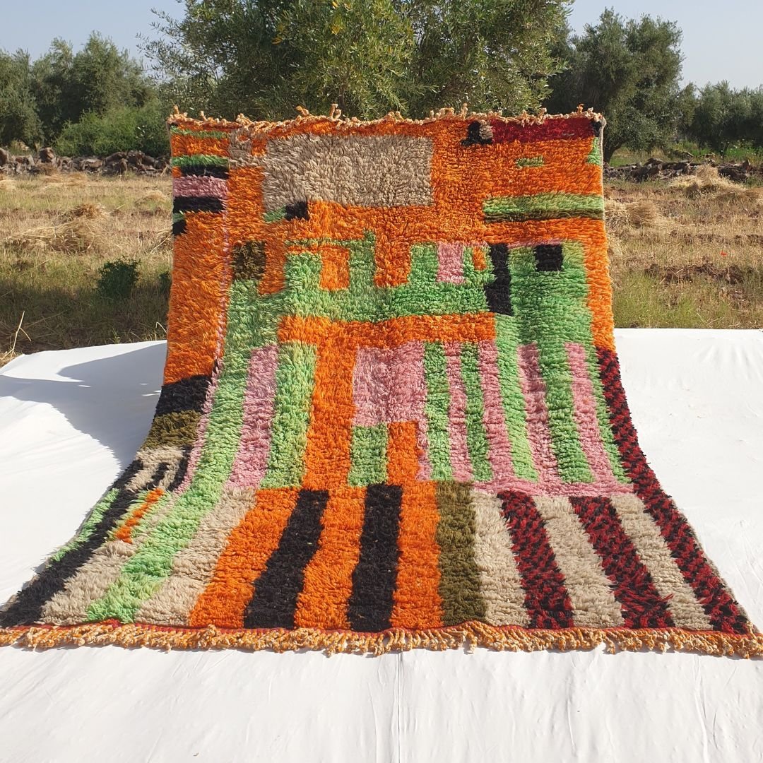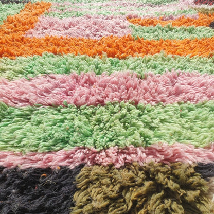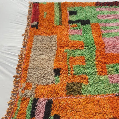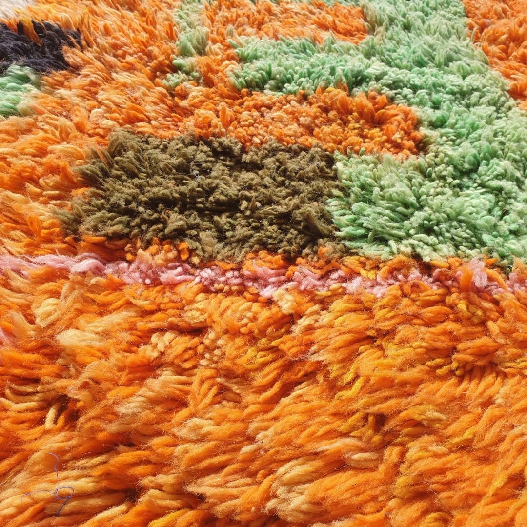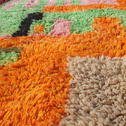 Add a splash of color to your space with this large Beni Mrirt luxurious rug, sized 7'22x10' Ft | 220x305 cm. Handwoven with exceptional craftsmanship, this ultra-soft, plush rug features a vibrant multicolored abstract design in orange, green, pink, black, and cream, perfect for making a bold statement in living rooms or dining rooms. Known for their unparalleled softness, Beni Mrirt rugs combine comfort and artistry. Crafted from 100% natural wool, this large Moroccan rug is a stunning addition to bohemian or modern decor.